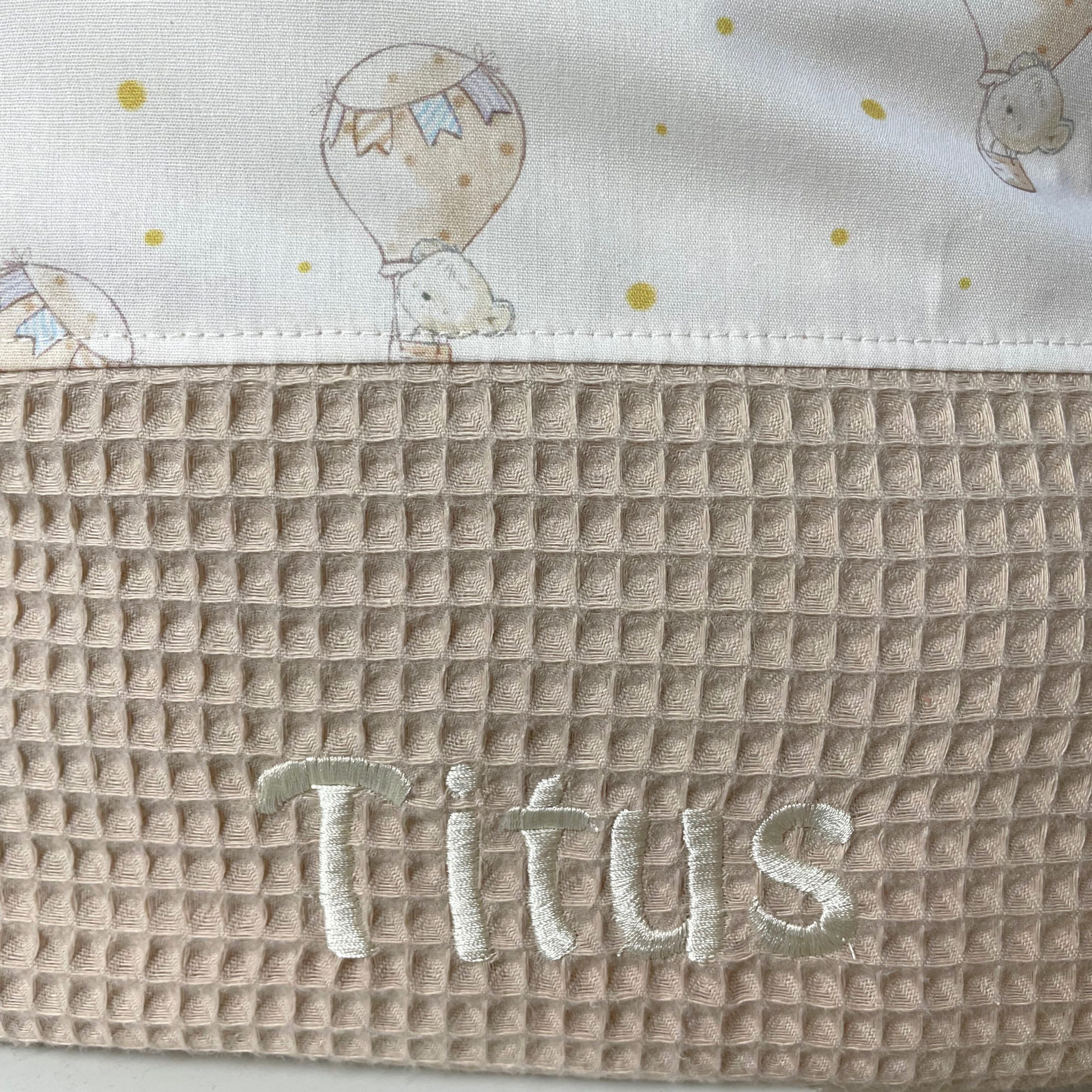 Die leichte Babydecke ist zweilagig und einmal rundherum abgesteppt. Rückseite ist aus wunderschönem Popeline Stoff. Der Name wird aus hochwertigem glänzendem Stickgarn gestickt,