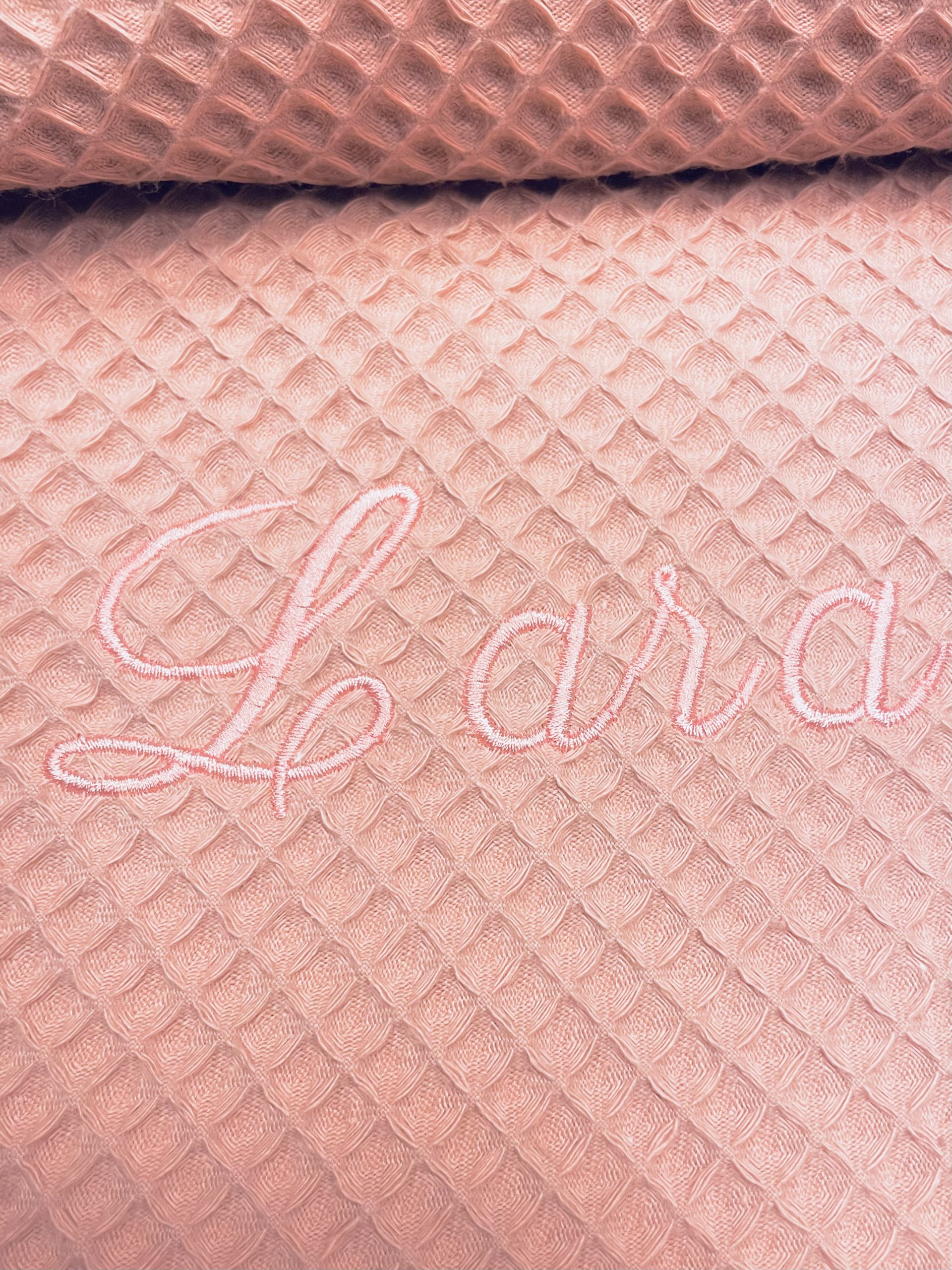Die Rückseite aus Musselin verleiht der Decke eine weiche Struktur, die angenehm auf der Haut liegt.Das Highlight: der Name Ihrer Babys wird mit hochwertigem Garn aufwendig gestickt und macht einen persönlichen Erinnerungsstück.