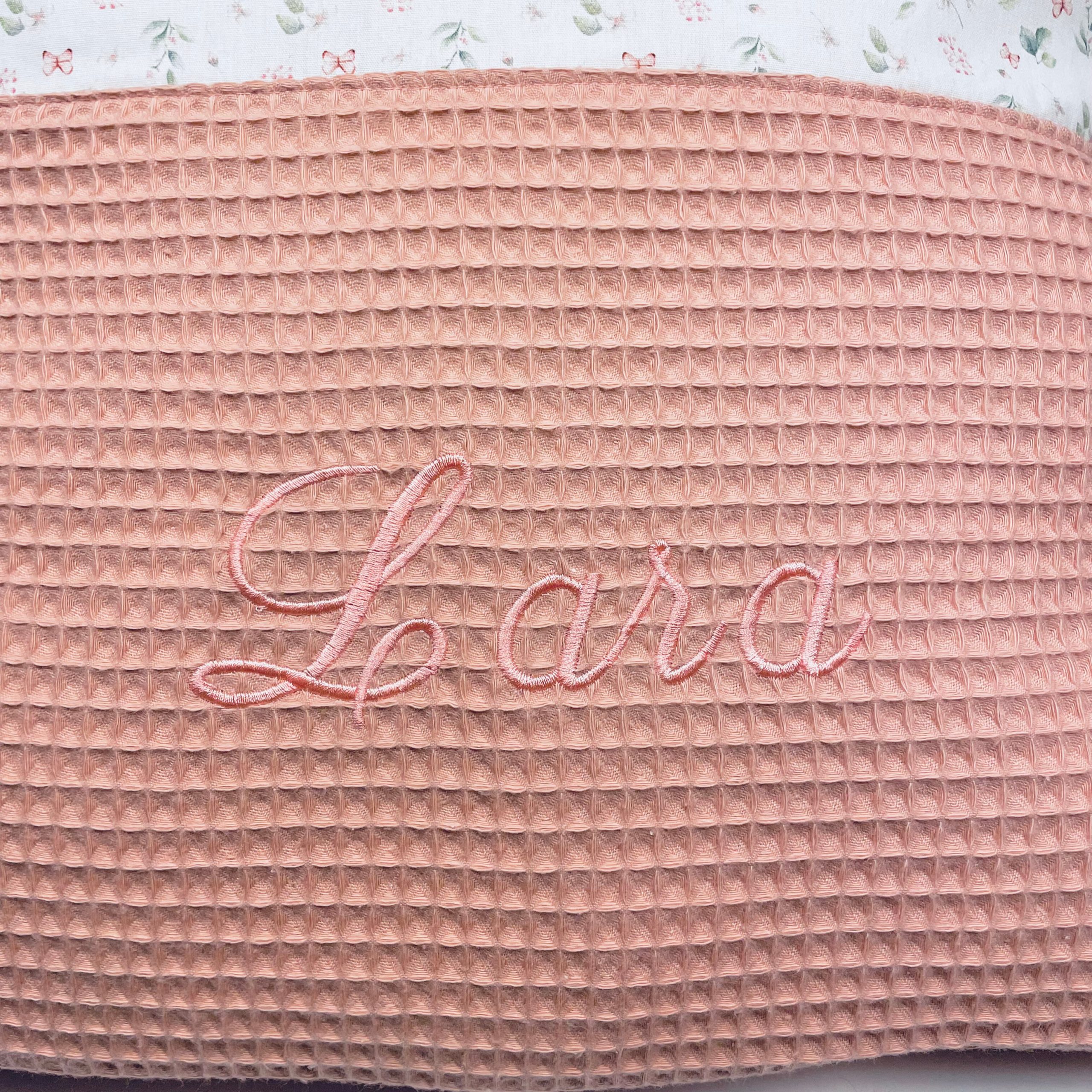 Die leichte Babydecke ist zweilagig und einmal rundherum abgesteppt. Rückseite ist aus wunderschönem Musselin Stoff. Der Name wird aus hochwertigem glänzendem Stickgarn gestickt,