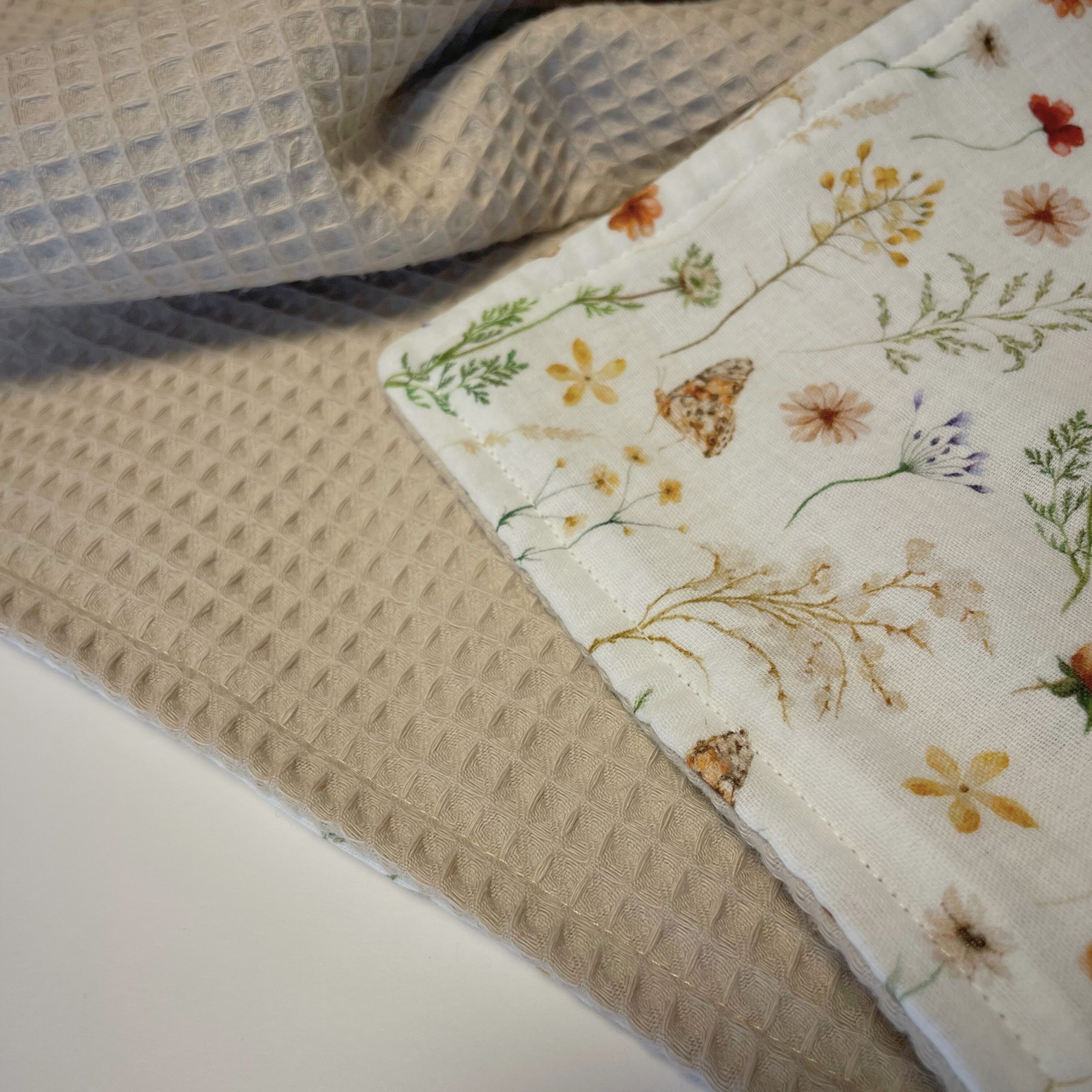 Größen gibt es : 70 x 100 cm Abweichungen von +/- 1-2cm können vorkommen Materialien: 100 % Baumwolle, Popeline weiß mit Schmetterlingen und Zweigen, Waffelpique in lachsrosaPflegehinweise : - waschen nur bei 30 Grad Pflegeleicht - nur mit Flüssigwaschmittel waschen - waschen ohne Weichspüler und sonstige Bleichmittel - unbedingt auf Wasserhärte achten - nicht im Trockner trocknen