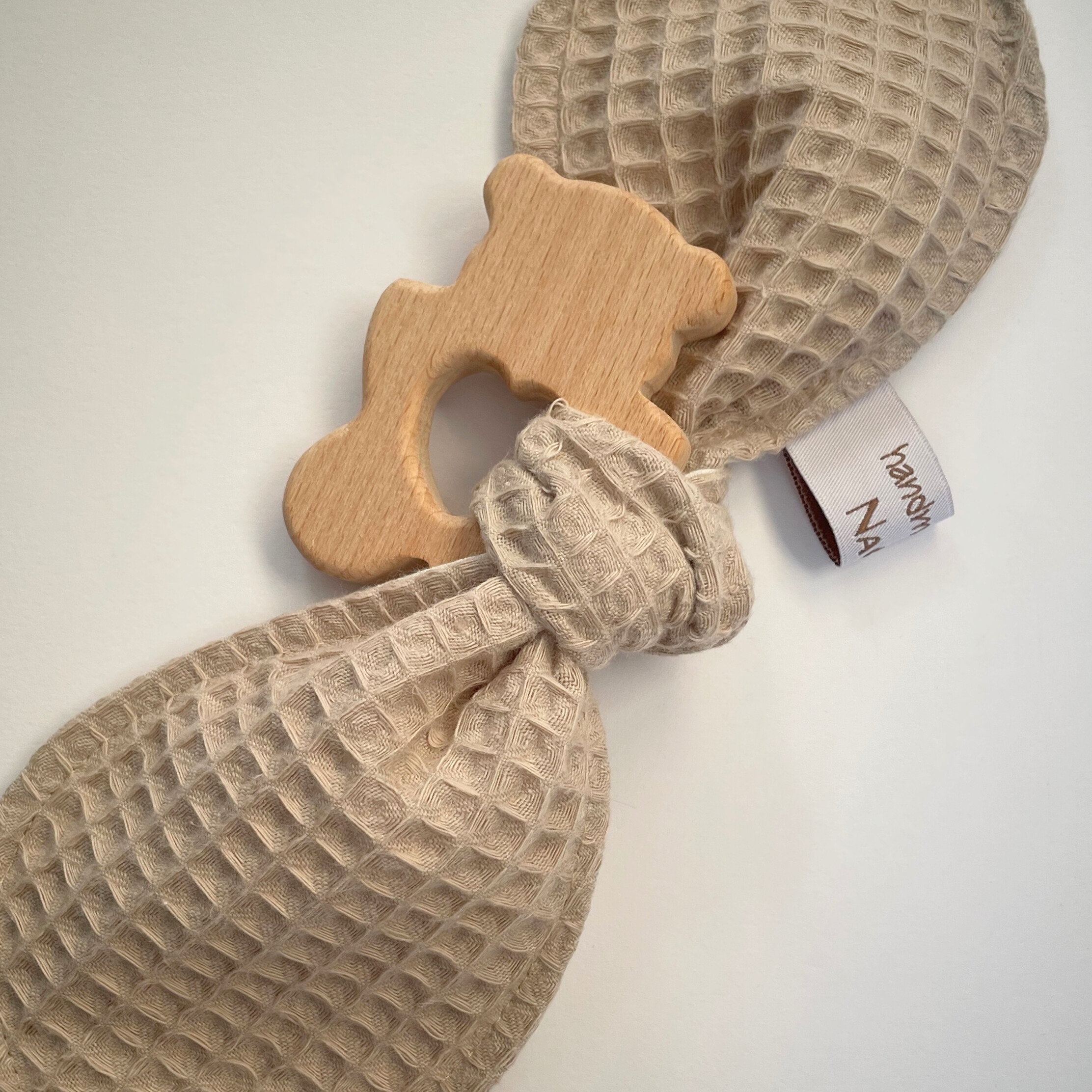 Liebevoll von uns gefertigter Greifring, bestehend aus Holz (Bär) und weichem Waffelpique. Waffelpique – 100% Baumwolle, Öko-Tex Standard 100 Naturholzring - Bär Der Stoff kann bei Feinwäsche 30° gewaschen werden.
