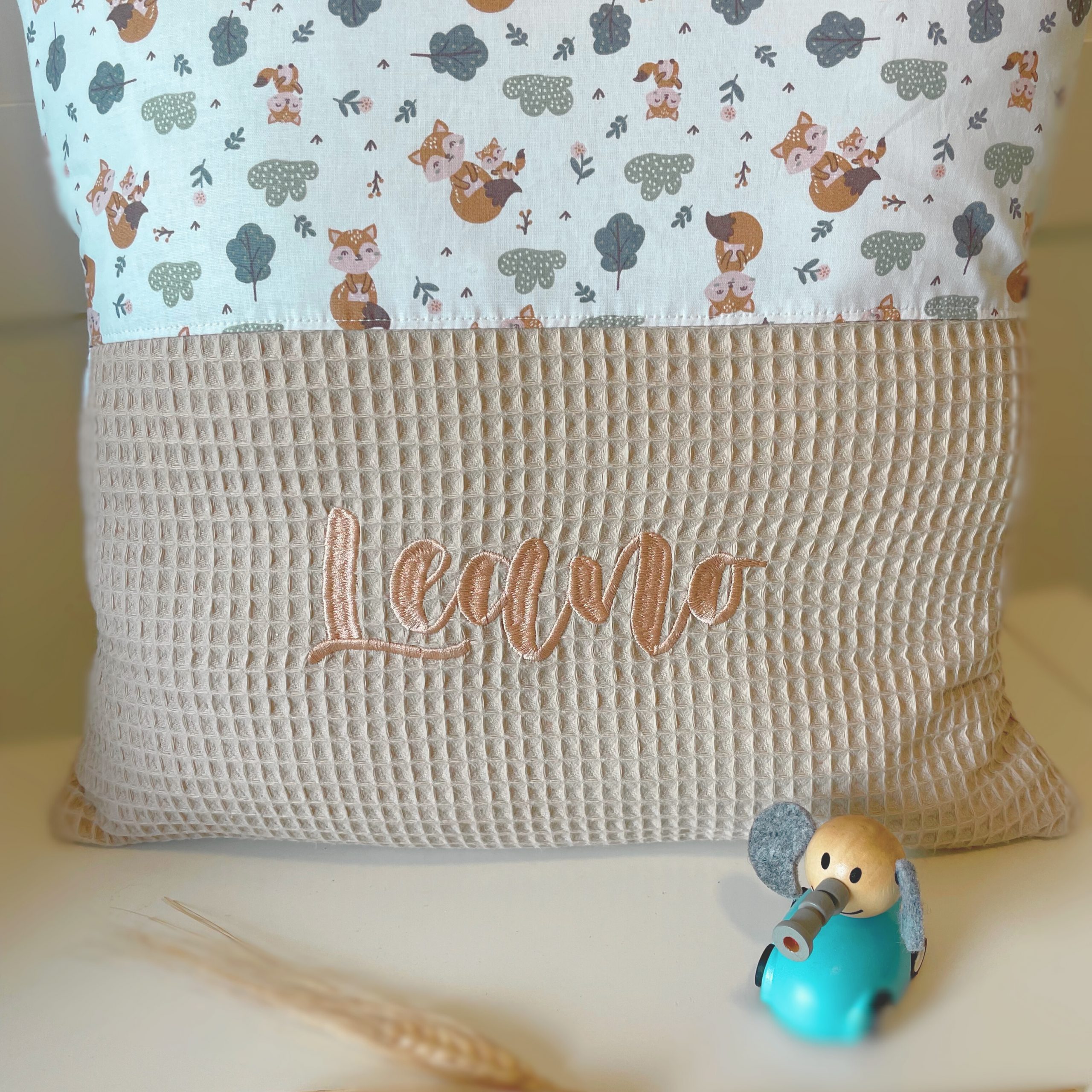 Einfach ein tolles Geschenk zu Geburt, zur Taufe, zum Geburtstag oder einfach mal so. Alles wird mit ganz viel Liebe auf eure Wünsche hergestellt. Das Kissen wird auf der Rückseite mit einem Hotelverschluss verschlossen. Dadurch kann man es auch problemlos waschen. Das Kissen besteht aus einer Kombination Popeline und Waffelpique. Beide Stoffe sind atmungsaktiv und Hautfreundlich. Bei uns könnt ihr aus dieser Kombination eine wunderschöne Auswahl an handgefertigten Produkten erhalten. Dazu gehören: - Beißring - Kissenbezug - Babydecke (auf Anfrage) - Wimpelkette 100% Baumwolle Kissen: 100%Polyesterfüllung Maße: ca. 40 x 40 cm incl. Füllkissen Bitte nur bei 30 Grad waschen und nicht in den Trockner geben. Danach einfach auf links bügeln und so habt ihr lange Freude daran.