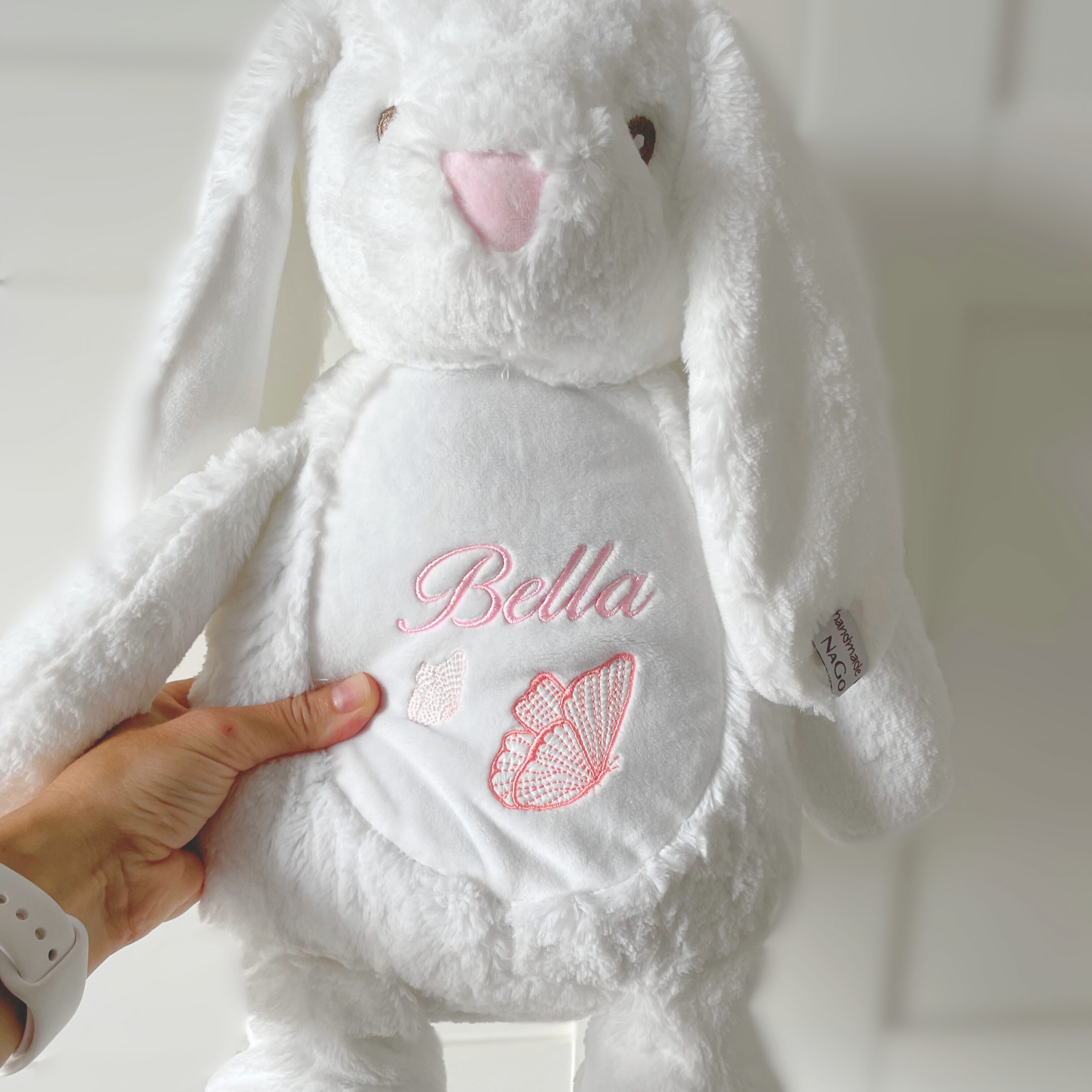 Dieser süße Hase wird individuell mit Wunschname und/oder Datum etc. bestickt. Lange Doppelnamen werden untereinander geschrieben, da sie ansonsten zu klein werden. CE zertifiziert. Pflege: Handwäsche Material: 100% Polyesterplüsch Größe: 40 cm