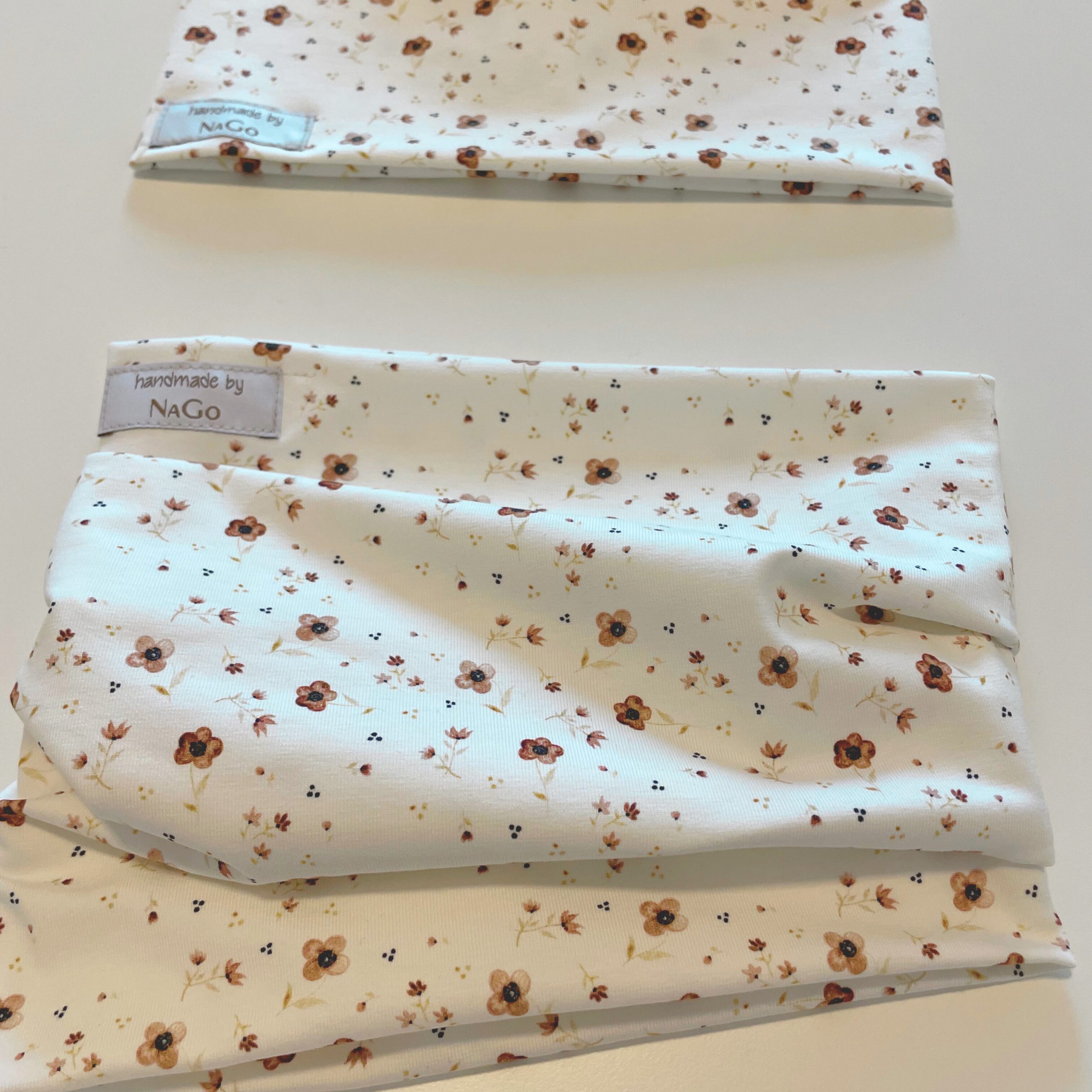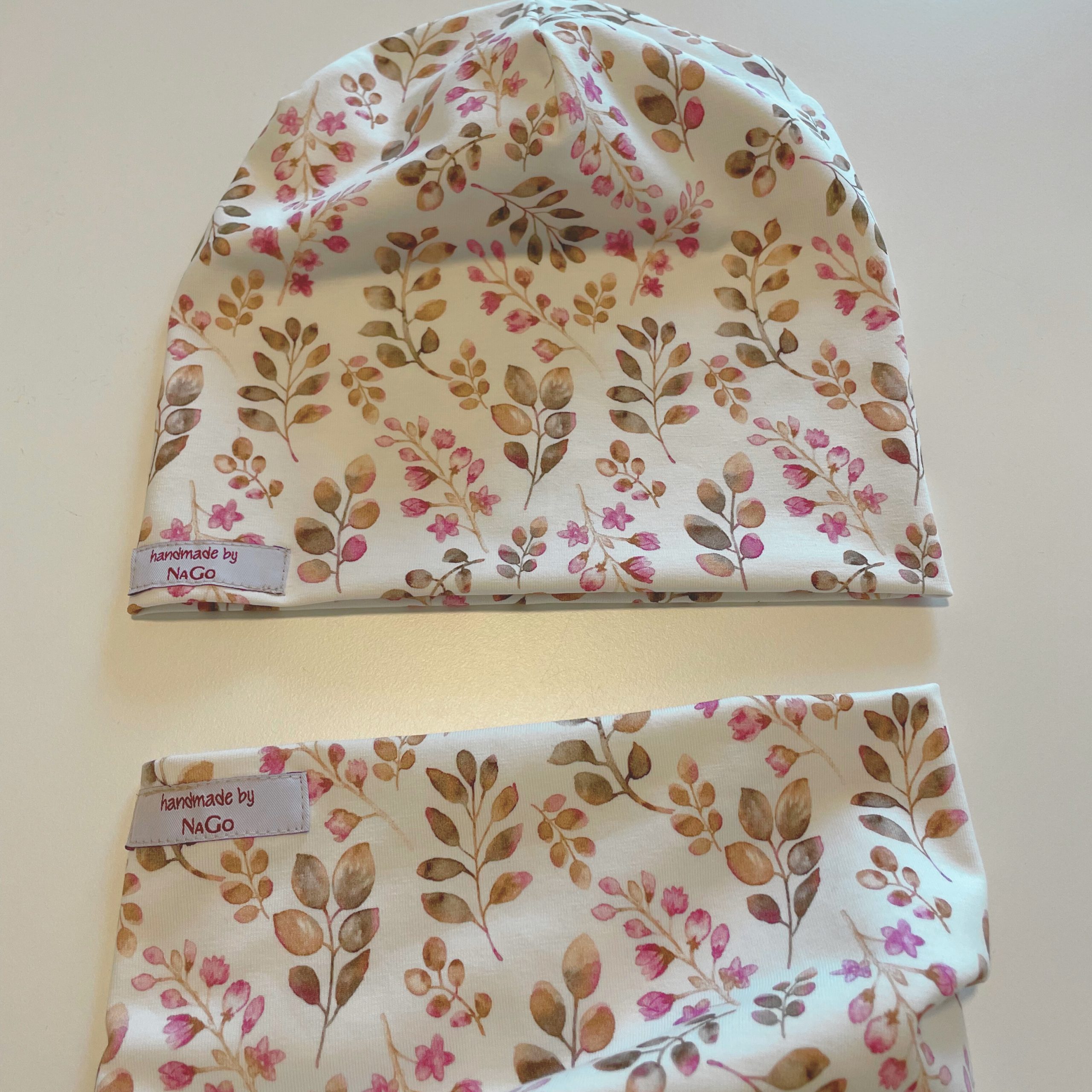 Das perferte Set als Allrounder für den Herbst oder für kühlere Sommertage. Die Größe richtet sich nach dem Kopfumfang des Kindes. Innenseite: aus dem gleichem Stoff Material : Ökotex Standard 100 94% Baumwolle, 6% Elasthan Mit dunkelbraunen kleinen Blümchen Pflege: 30 Grad Feinwäsche, bitte nicht in den Trockner geben.