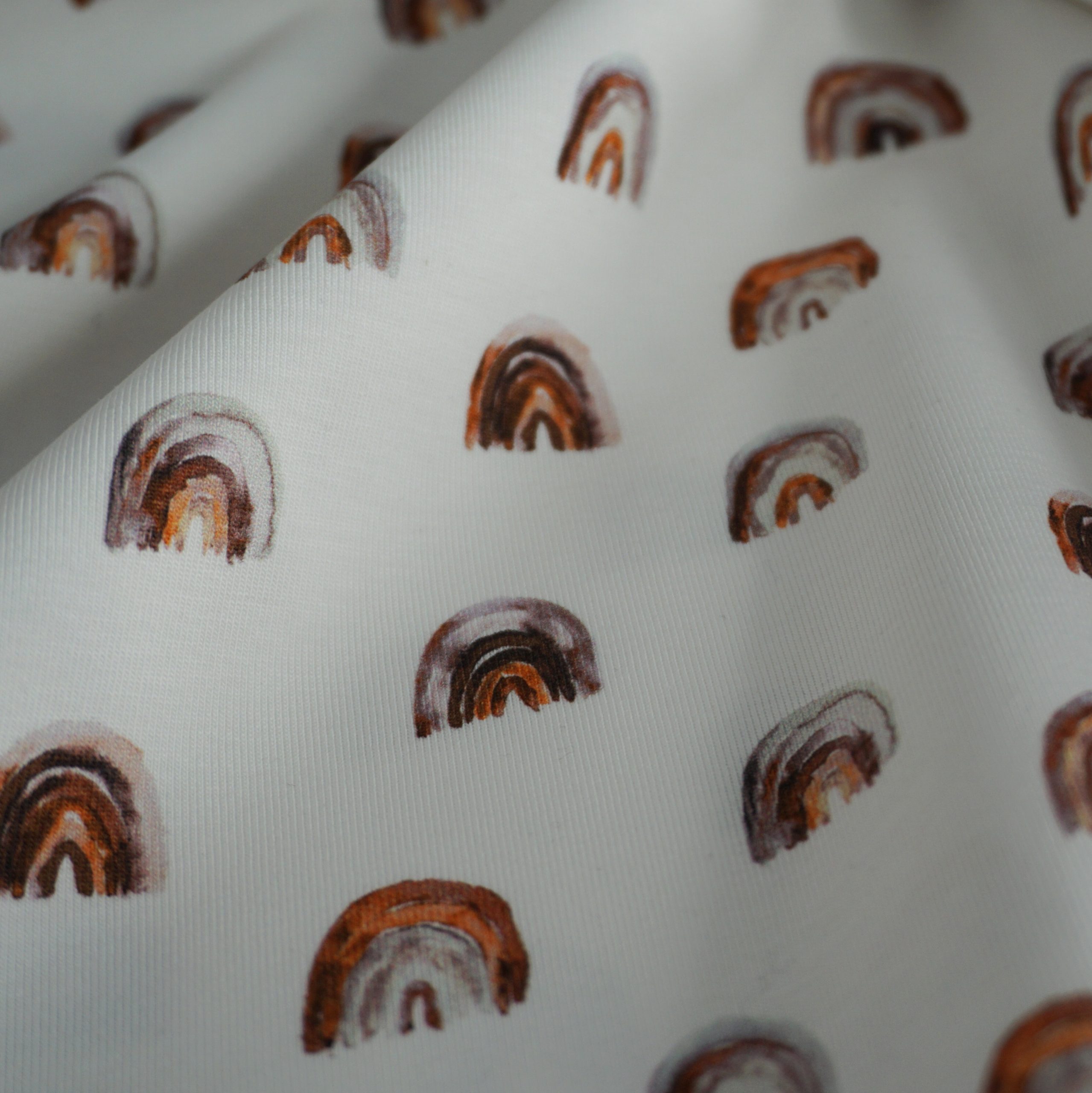 Material: 92% Baumwolle, 8% ElastanBreite: 145 cmGewicht: 220 g/m²Farbe: weiß mit Digitaldruck Regenbogen