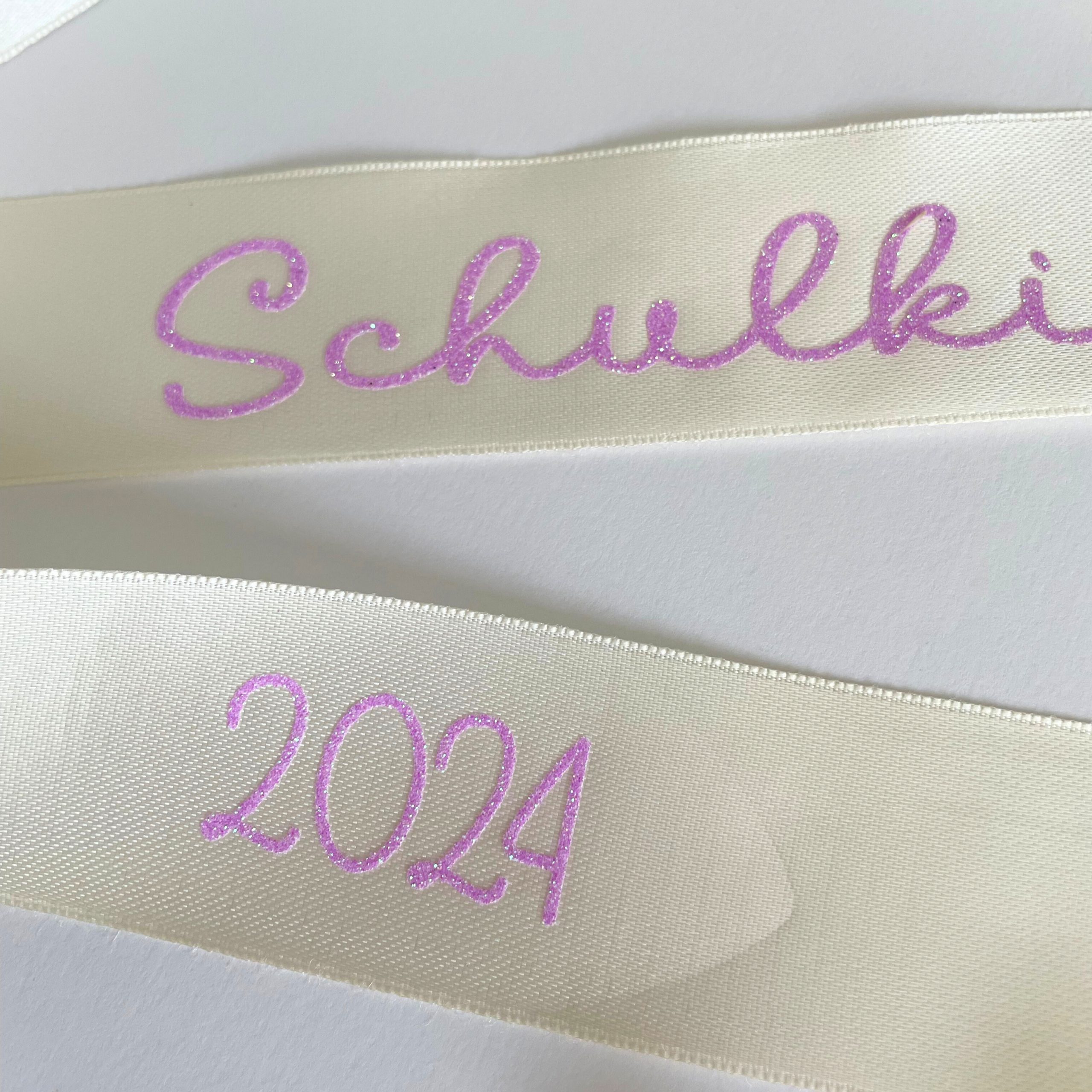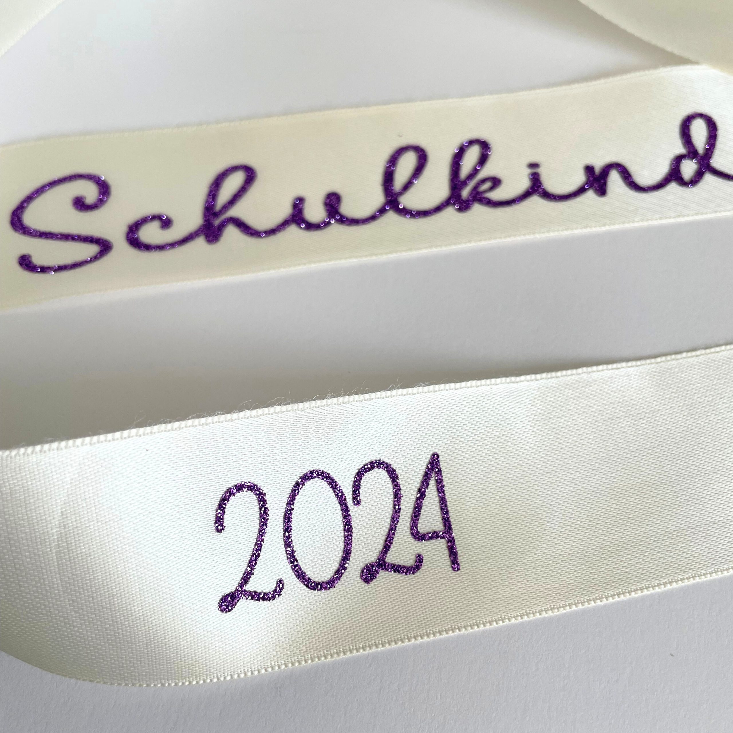 Liebevoll gestaltetes Satinband für die Schultüte, es kann zur Schleife gebunden werden. Ideal für den ersten Schultag Das Schulkind und das Jahr wird aus Folie geschnitten (geplottet) und heiß auf Satinband gepresst. Das Satinband hat eine 140 cm Gesamtlänge. Breite: 4 cm Satinband Farbe: creme Schrift: neonlila Pflegehinweis: Handwäsche empfohlen, um die Qualität der Satinbänder zu erhalten.
