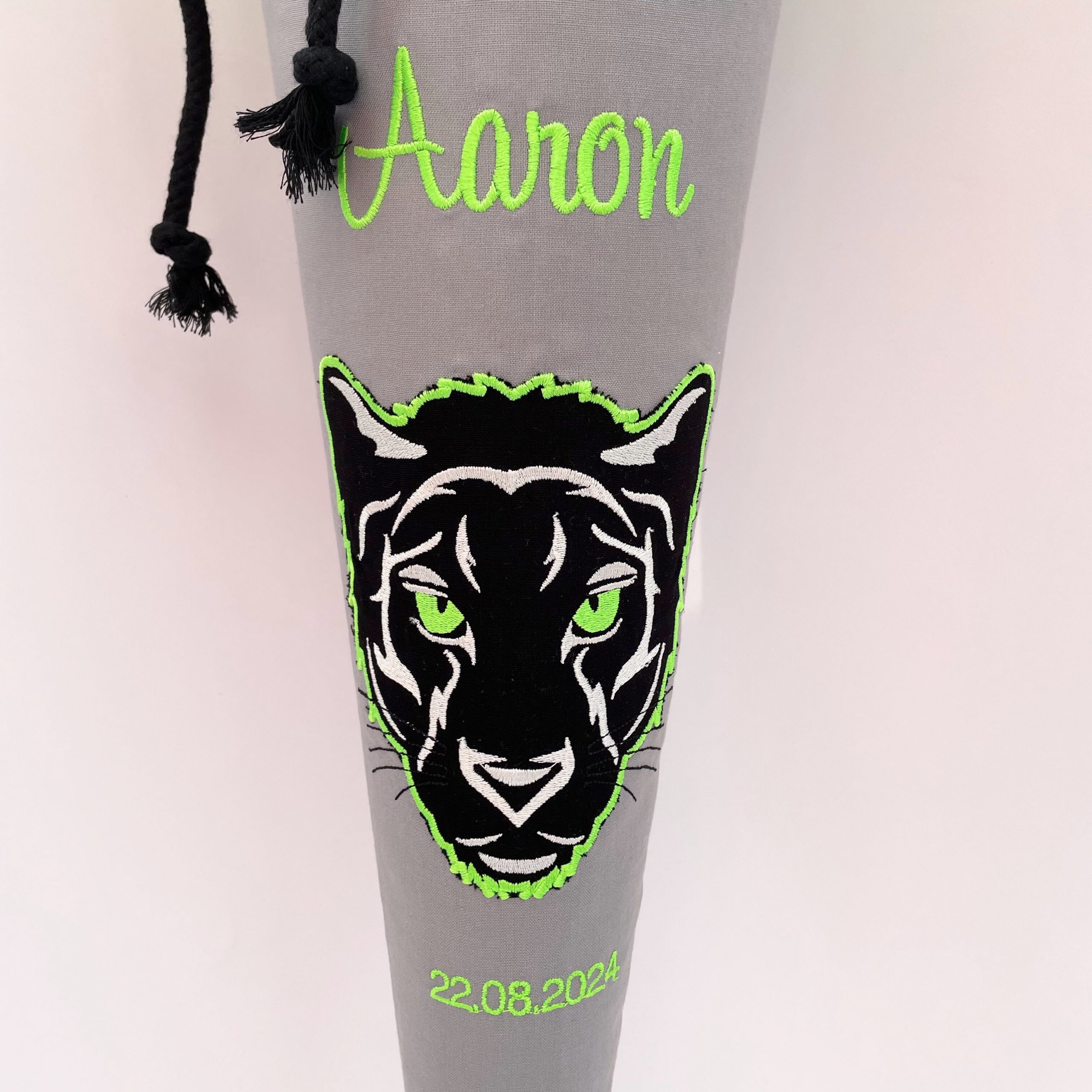 Wunderschöne Schultüte wurde aus Baumwollstoff genäht und mit Panther-Design bestickt. Der Name des Kindes wird kostenlos oberhalb des Motivs bestickt. Auf Wunsch mit Datum der Einschulung (ohne Aufpreis) Nach der Einschulung kann der Papprohling entfernt und gegen ein Kisseninlett (NICHT enthalten) getauscht werden. Hellgrauer -/ hellgrüner Baumwollstoff 100% Stickgarn: Madeira in neongrün Kordel, Zackenlitze Stickdatei: cherrymoiaEmbroidery