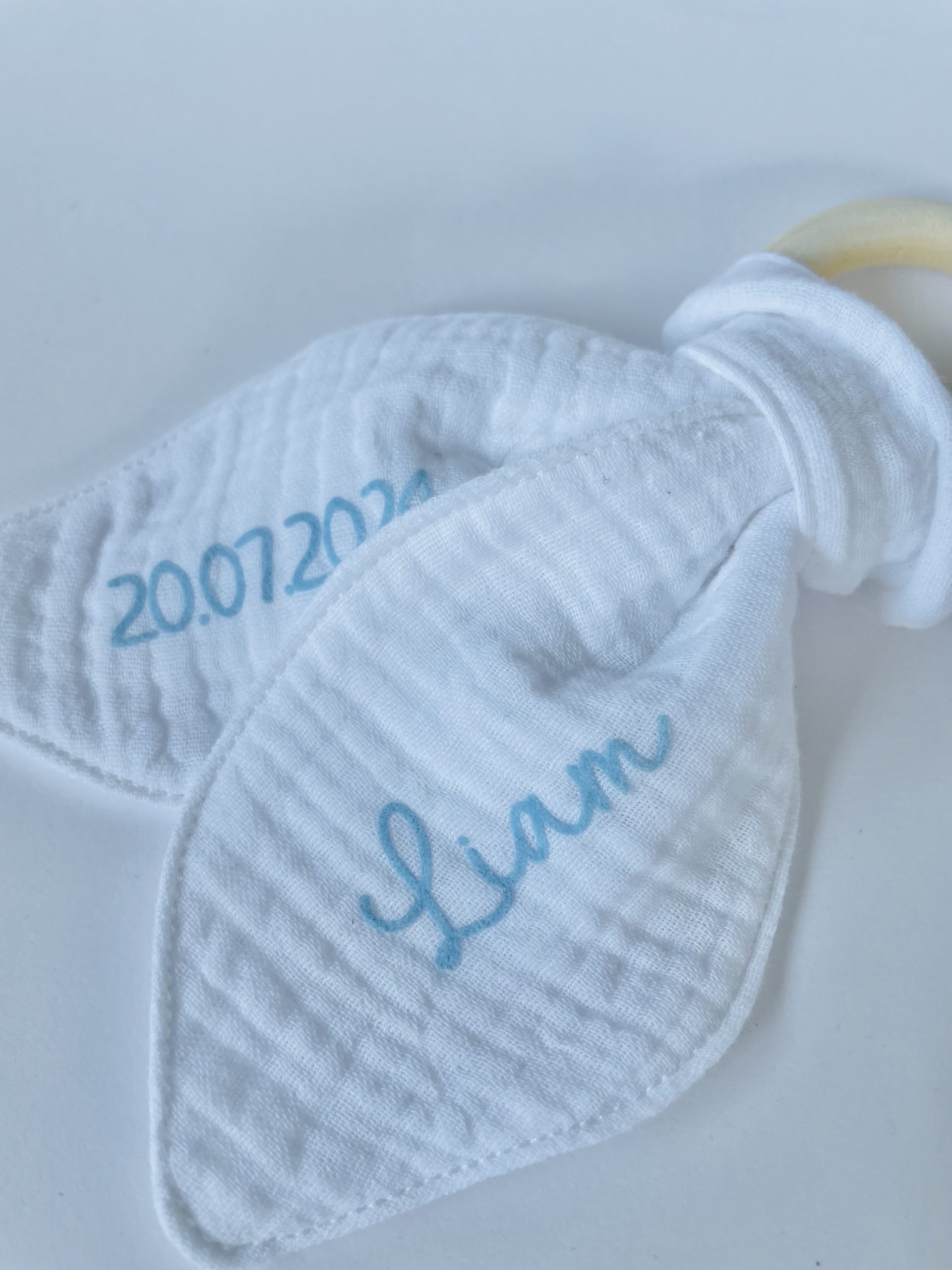 Beißring aus Holz mit weichen Hasenohren Der runde Holzring ist aus unbehandelter Buche und Musselinstoff aus 100% Baumwolle. Sehr gern kann das Tüchlein gegen Aufpreis mit einem Namen beplottet (Flockfolie) werden. Der Buchenholzring hat einen Durchmesser von 8 cm und eine Dicke von 1,5 cm. Musselinstoff – 100% Baumwolle, Öko-Tex Standard 100 Naturholzring aus Buchenholz unbehandelt Die Flockfolie überzeugt durch einer weichen, samtartigen Haptik. Die Folie basiert auf ökologisch unbedenklichen Rohstoffen und ist frei von PVC und Weichmachern. KEINE LAGERWARE die Fotos dienen nur zur Inspiration. Verkauf ohne Deko. Personalisierte Anfertigungen sind vom Umtausch ausgeschlossen,
