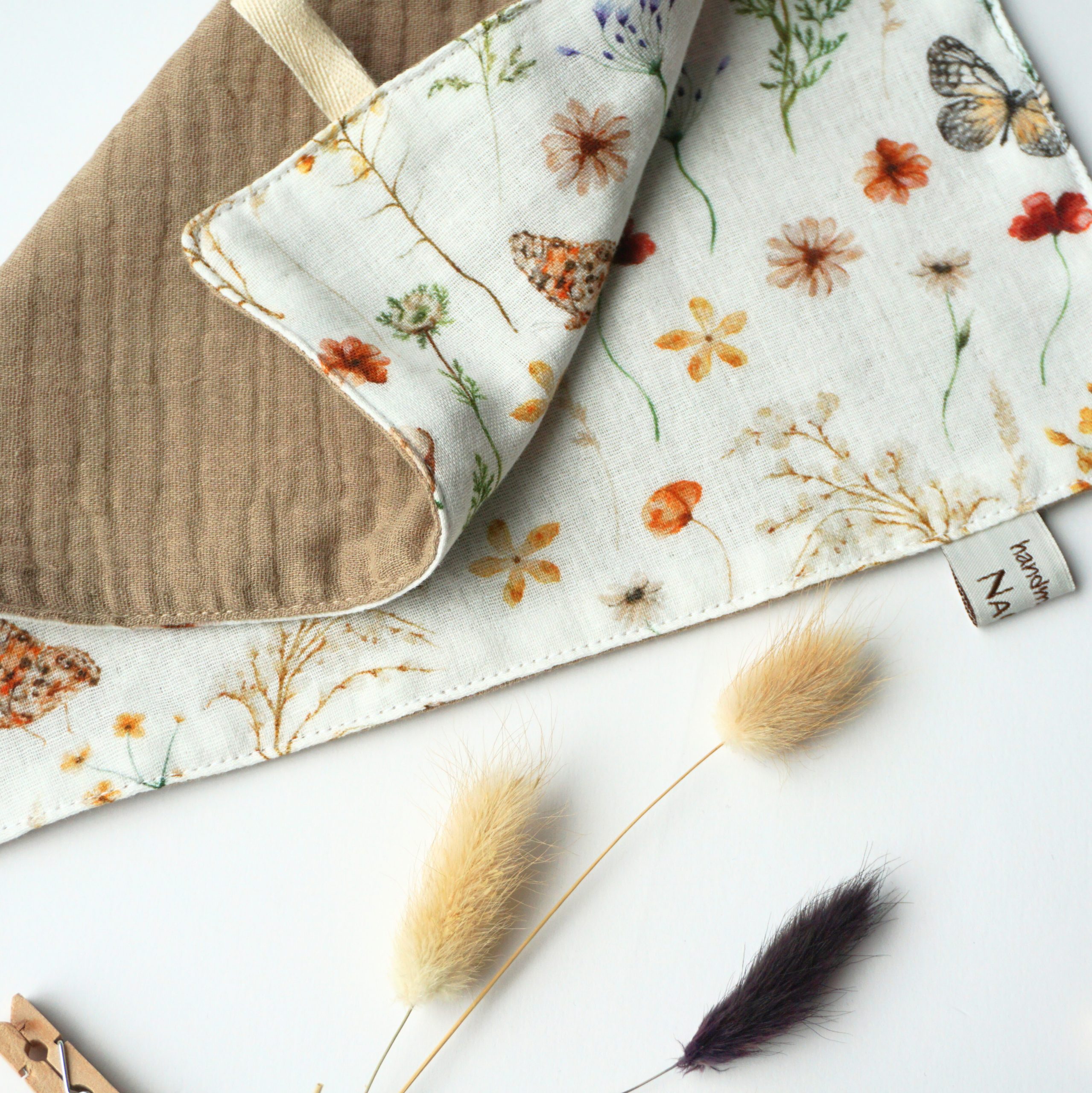 Saugfähiges Musselintuch / Spucktuch mit Schlaufe zum Hängen, doppelt genäht. Maße: 27 x 27 cm 100% Baumwolle Öko-Tex zertifizierter Stoff zwei farbiges Musselintuch: eine Seite sand, eine Seite weiß mit Natur / Schmetterlingen / Blumenwiese Normalwäsche 40°C · Nicht heiß bügeln · Nicht Trockner geeignet · Keine Chemische Reinigung