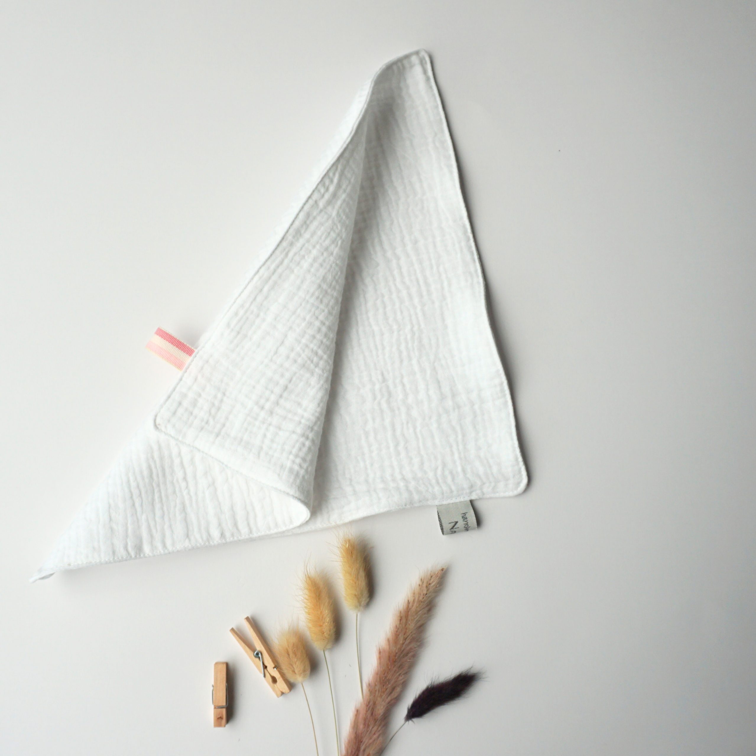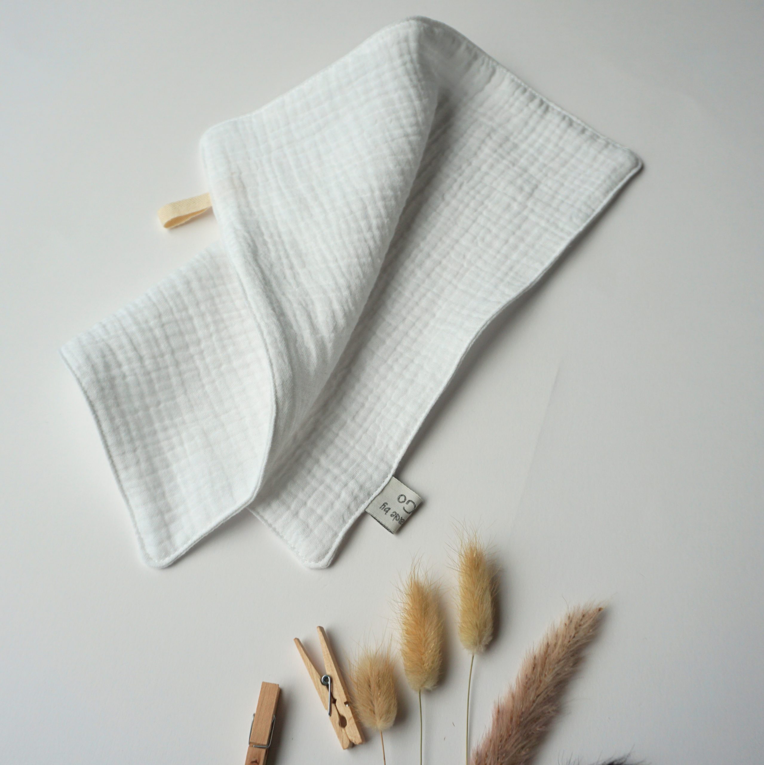 Saugfähiges Musselintuch / Spucktuch mit Schlaufe zum Hängen, doppelt genäht. Maße: 27 x 27 cm 100% Baumwolle Öko-Tex zertifizierter Stoff Farbe: weiß Normalwäsche 40°C · Nicht heiß bügeln · Nicht Trockner geeignet · Keine Chemische Reinigung