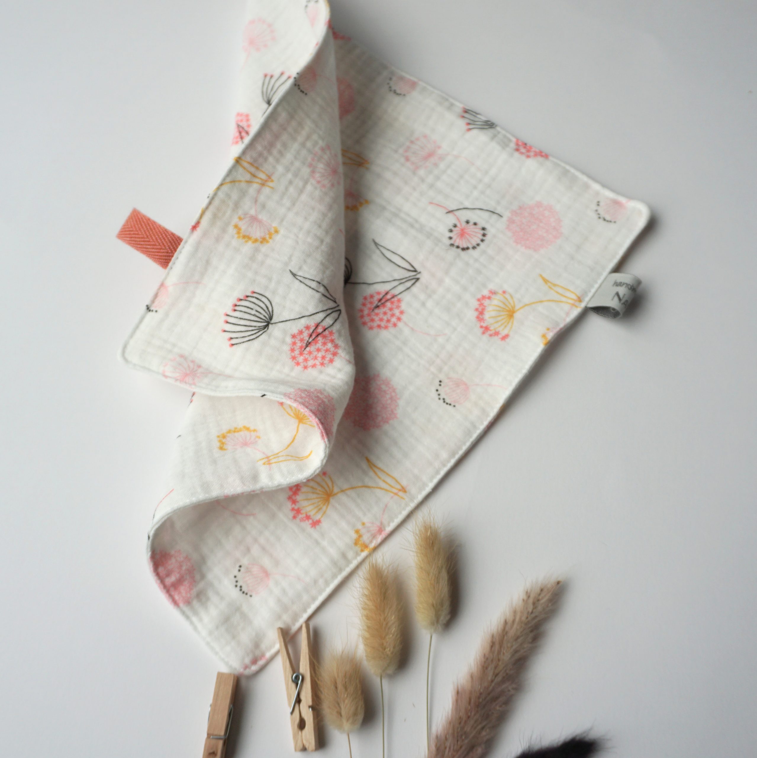 Saugfähiges Musselintuch / Spucktuch mit Schlaufe zum Hängen, doppelt genäht. Maße: 27 x 27 cm 100% Baumwolle Öko-Tex zertifizierter Stoff Farbe: weiß mit rosa Pusteblumen Normalwäsche 40°C · Nicht heiß bügeln · Nicht Trockner geeignet · Keine Chemische Reinigung