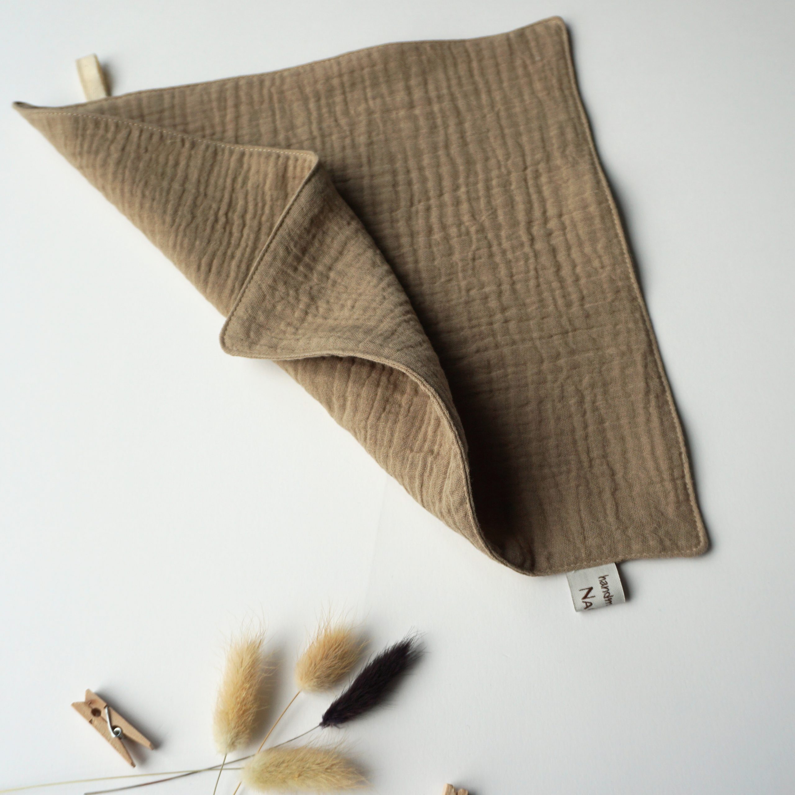 Saugfähiges Musselintuch / Spucktuch mit Schlaufe zum Hängen, doppelt genäht. Maße: 27 x 27 cm 100% Baumwolle Öko-Tex zertifizierter Stoff Farbe: sand Normalwäsche 40°C · Nicht heiß bügeln · Nicht Trockner geeignet · Keine Chemische Reinigung