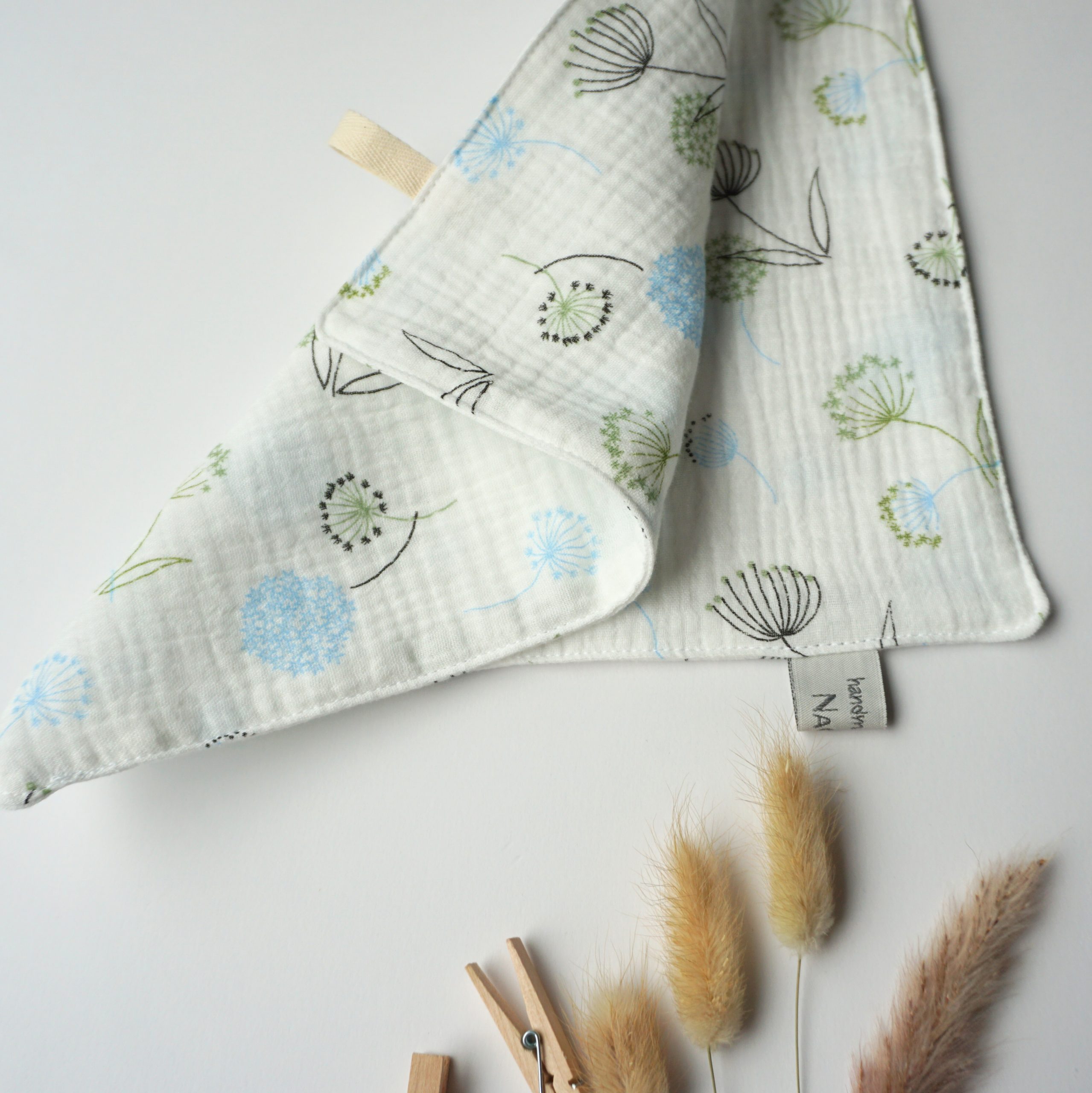 Saugfähiges Musselintuch / Spucktuch mit Schlaufe zum Hängen, doppelt genäht. Maße: 27 x 27 cm 100% Baumwolle Öko-Tex zertifizierter Stoff Farbe: weiß mit hellblauen Pusteblumen Normalwäsche 40°C · Nicht heiß bügeln · Nicht Trockner geeignet · Keine Chemische Reinigung