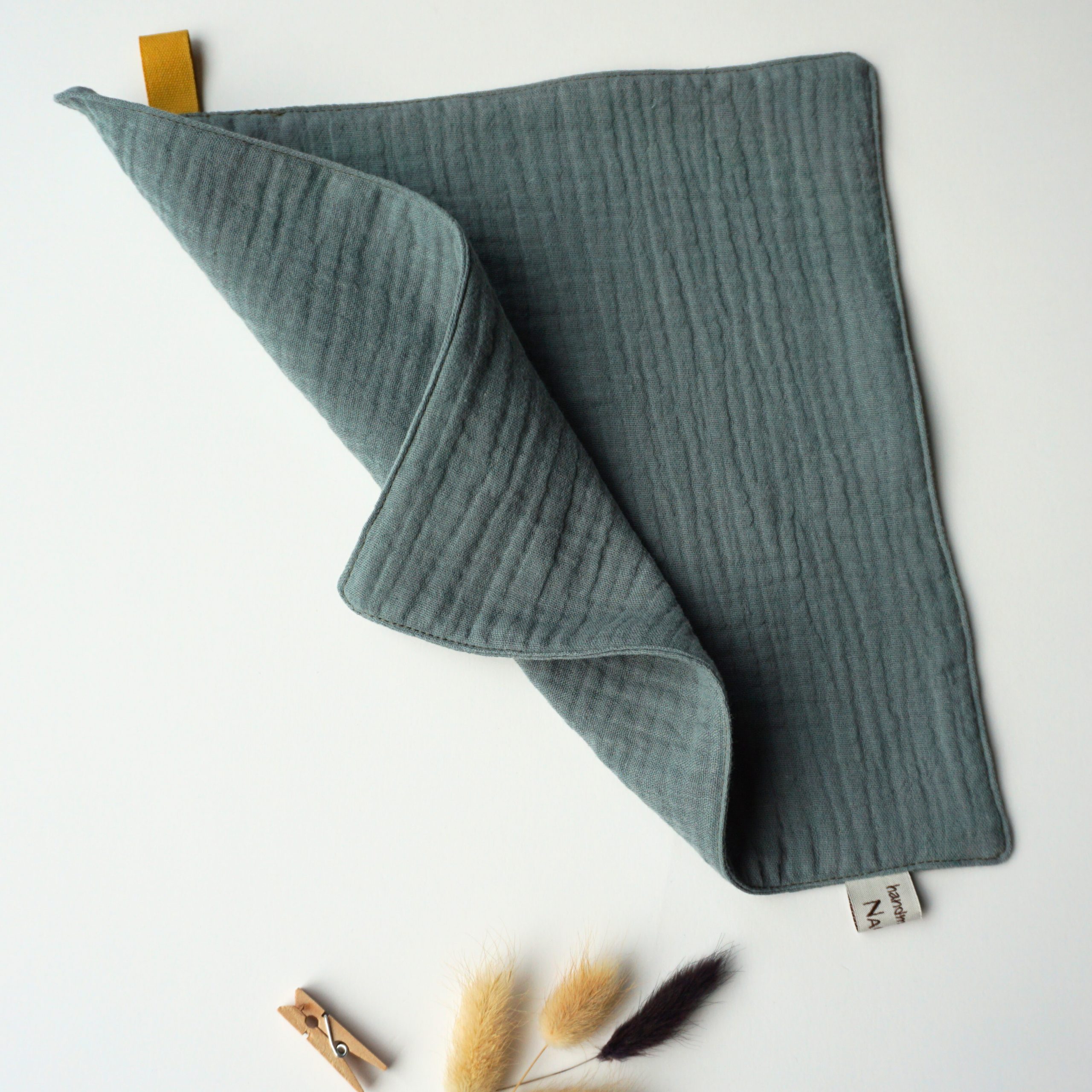 Saugfähiges Musselintuch / Spucktuch mit Schlaufe zum Hängen, doppelt genäht. Maße: 27 x 27 cm 100% Baumwolle Öko-Tex zertifizierter Stoff Farbe: blaugrau Normalwäsche 40°C · Nicht heiß bügeln · Nicht Trockner geeignet · Keine Chemische Reinigung