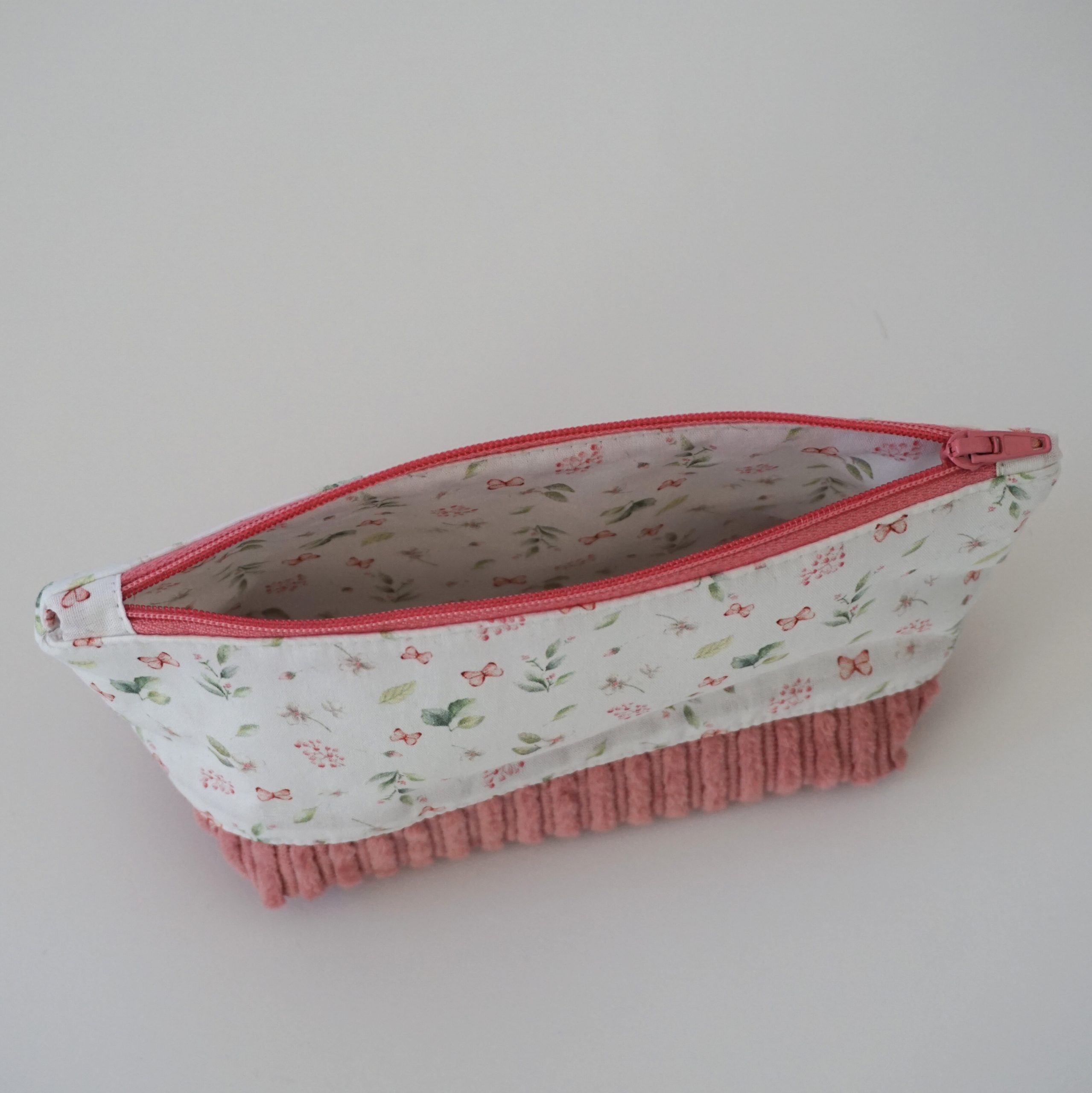 Cord in altrosa und weißer Baumwollstoff mit Schmetterlingen