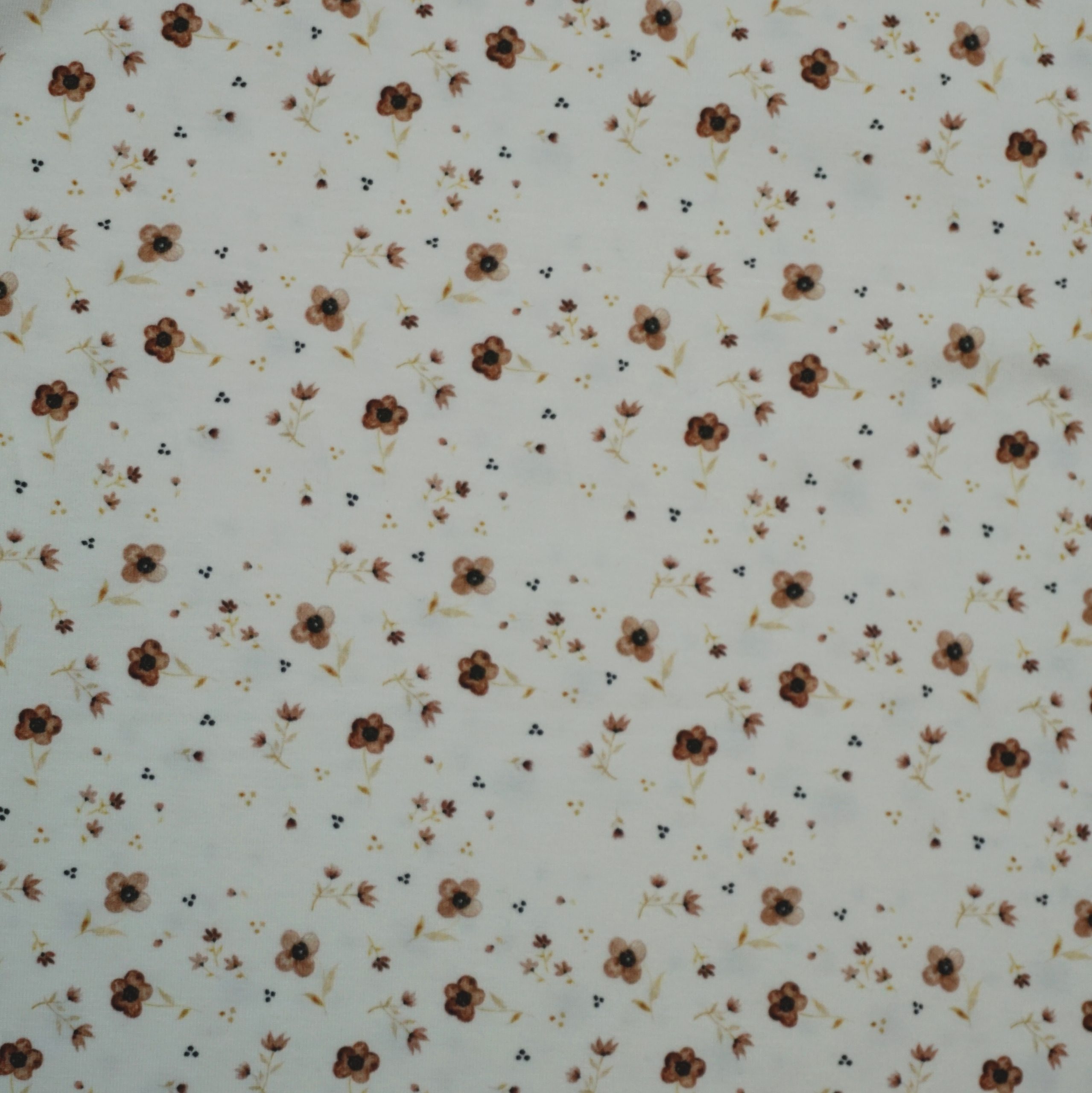 Weiches Baumwolljersey mit kleinen braunen BlumenDer Jersey eignet sich gut für Kinderkleidung, z. B. Kleider, Pullover, Babyhosen, Babydecke, Stirnbänder, oder Schal.Bitte beachte, dass je nach Bildschirmeinstellung die Farben vom echten Produkt abweichen können. Zusammensetzung:Material: 92% Baumwolle, 8% ElastanBreite: 145 cmGewicht: 220 g/m²Digitaldruck mit kleinen braunen BlumenOekotex Standard 100 Pflegehinweise: Normalwäsche 30°C · Nicht heiß bügeln · Nicht Trockner geeignet · Keine Chemische ReinigungEine Bestelleinheit entspricht 0,5 Meter.