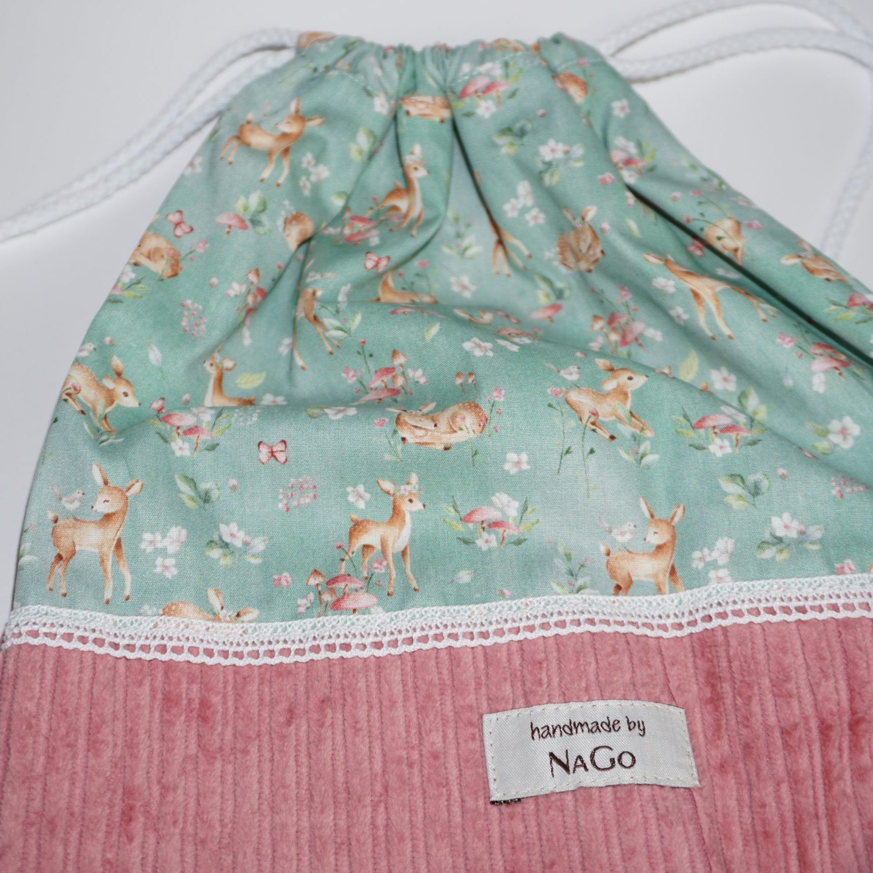 Beutel mit Zugkordel aus Baumwolle und Kord Maße: ca. 26x35cm Das Zugband hat eine Gesamtlänge von ca. 1,10 m Kordel: 100% Baumwolle (Dicke 5mm) Material Außenstoff: Cord in altrosa / grün mit Rehkitzen Innenstoff: 100% Baumwolle in der Farbe grün mit Rehkitzen Pflege: 30 Grad Feinwäsche, bitte nicht in den Trockner geben.