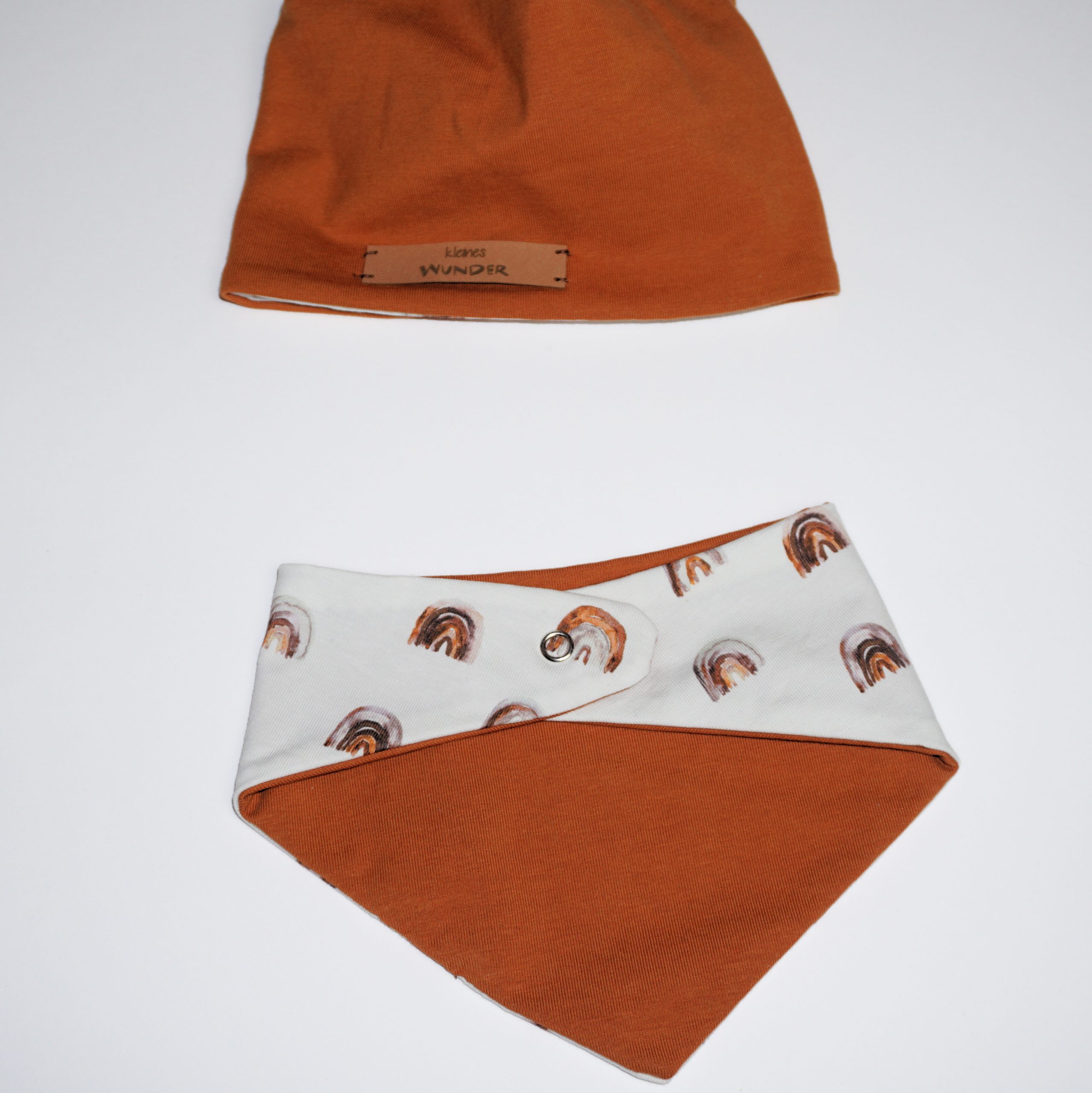 Wende Mütze und Halstuch mit Regenbogen. Mütze und Halstuch sind aus Jersey in uni cognac und Regenbogen in Brauntönen. Erhältlich als Mütze einzeln oder als Set Mütze und Halstuch. Material: 95% Baumwolle 5% Elastan Kleines Label "kleines Wunder" Farbe: cognac uni, und creme mit Regenbogen in brauntönen Pflege: 30 Grad Feinwäsche, bitte nicht in den Trockner geben.
