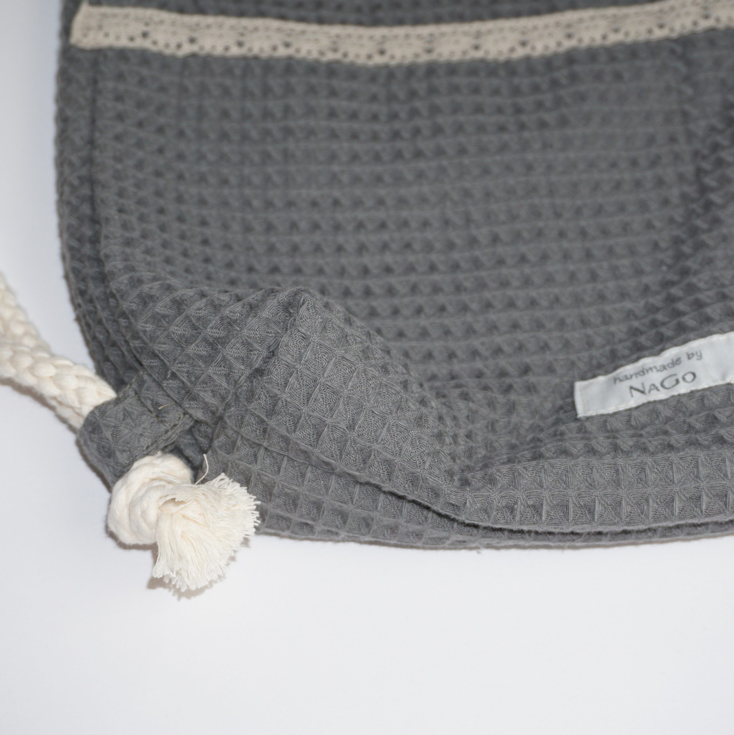 Beutel mit Zugkordel aus grauem Waffelpué Maße: ca. 31x42cm Das Zugband hat eine Gesamtlänge von ca. 1510 m Kordel: 100% Baumwolle (Dicke 10mm) creme Material Außenstoff: Waffelpiqué grau Innenstoff: 100% Baumwolle in türkis mit grauen Blumen Pflege: 30 Grad Feinwäsche, bitte nicht in den Trockner geben. Bitte beachte, dass je nach Bildschirmeinstellung die Farben vom echten Produkt abweichen können.