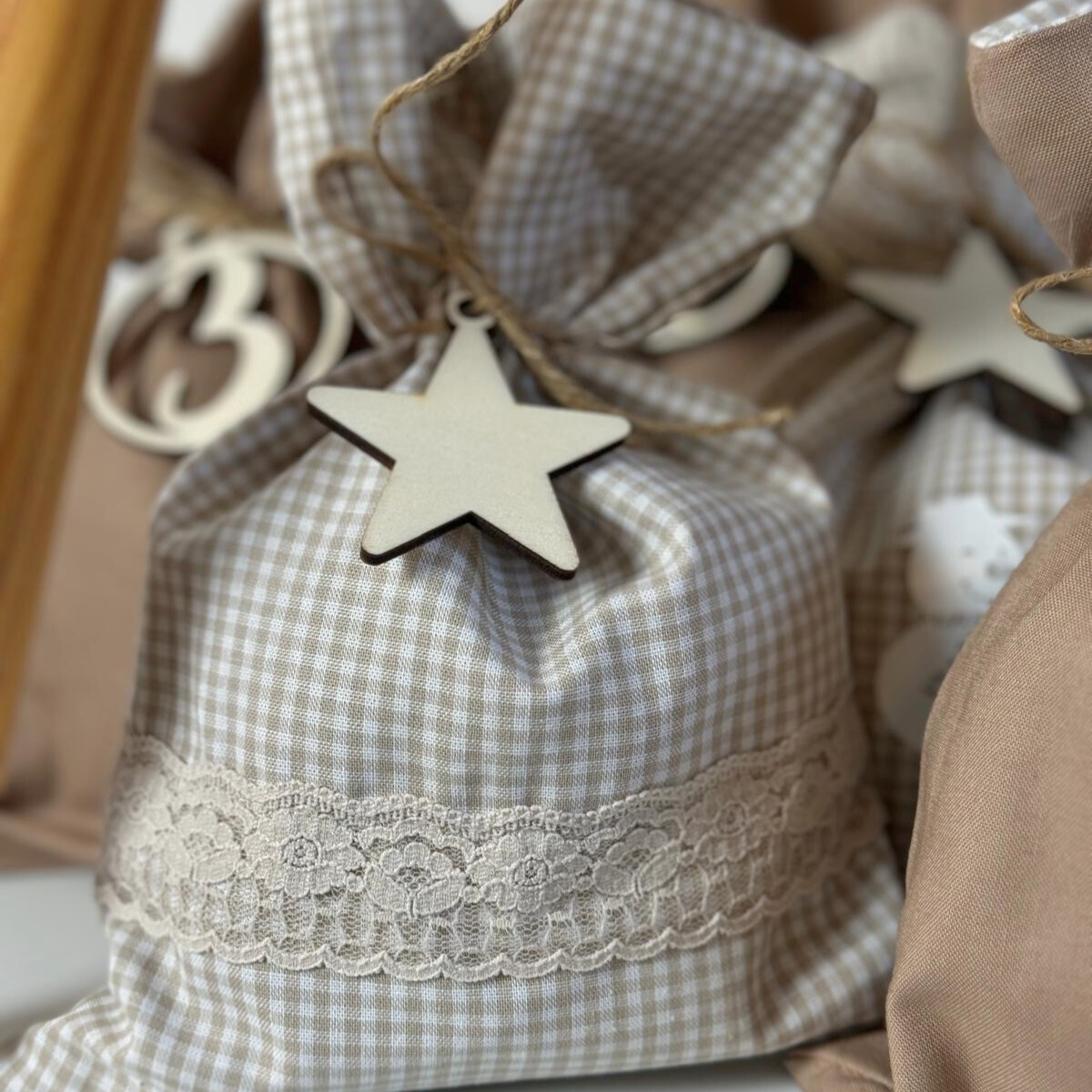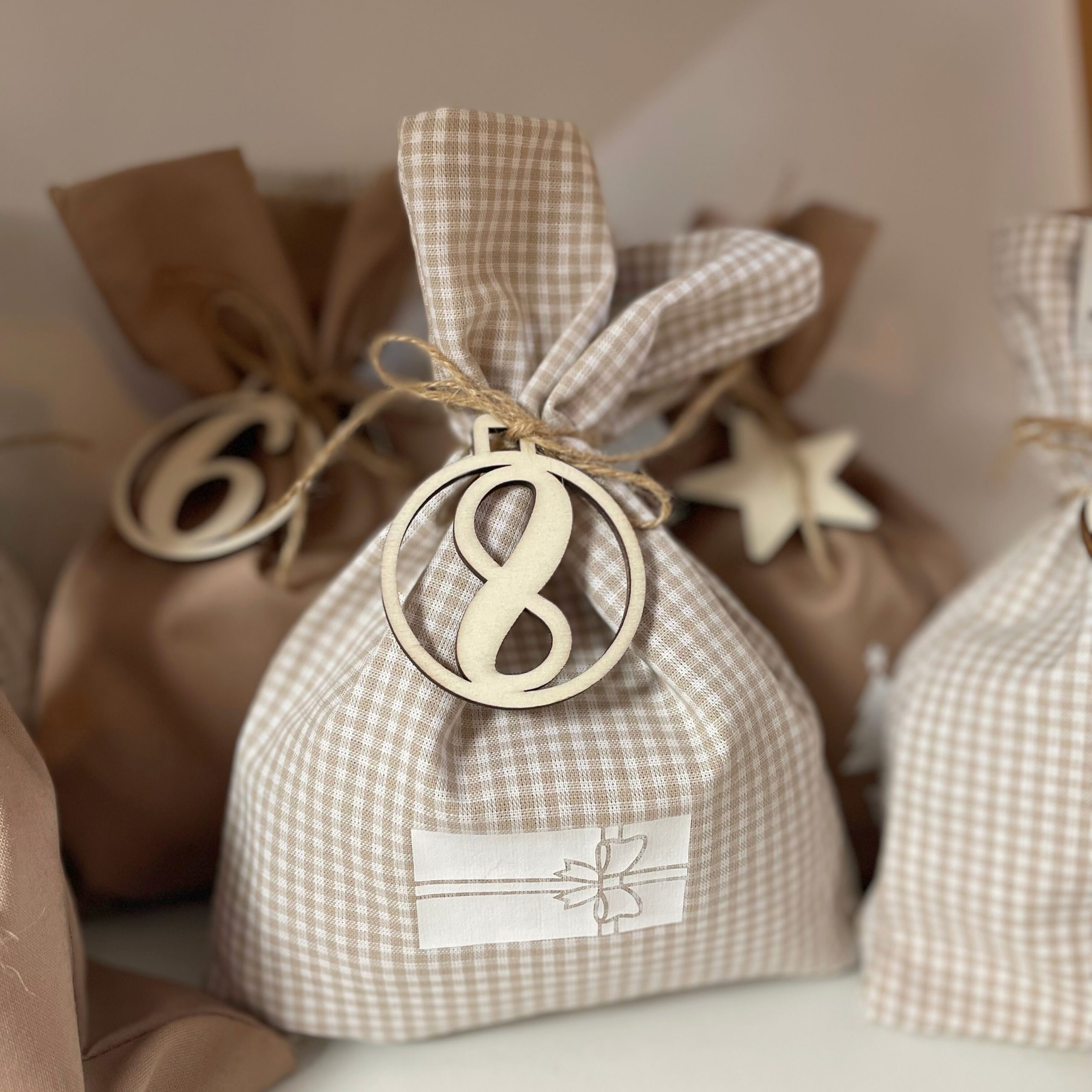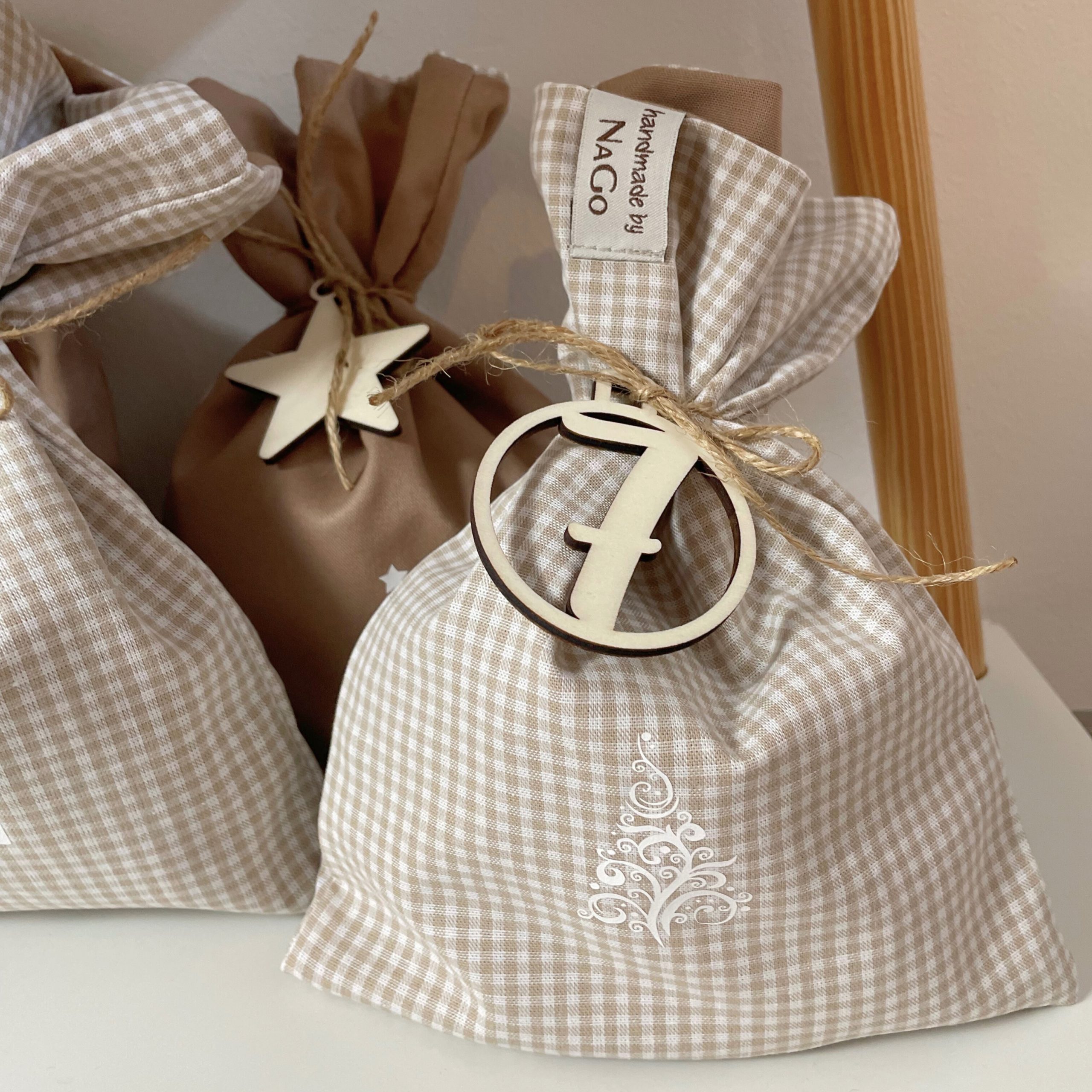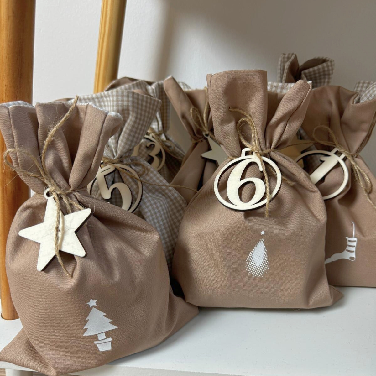 Dank der Bänder lassen sich die Säckchen einfach verschließen und aufhängen – perfekt für Aventsdekoration, ob an einem Weihnachtsbaum, einer Girlande oder einem dekorativen Ast. Die Säckchen sind in verschiedenen Farben und Mustern erhältlich.