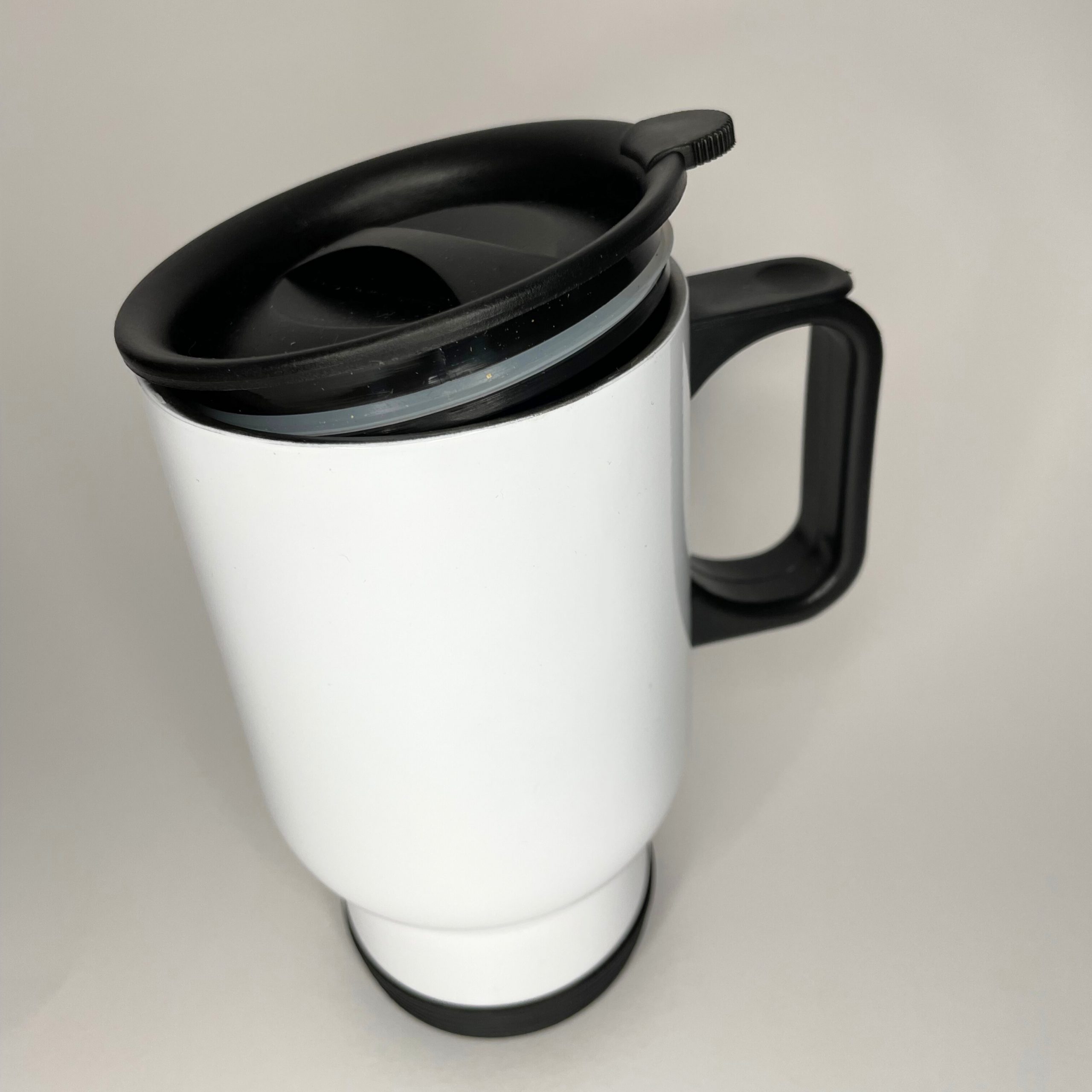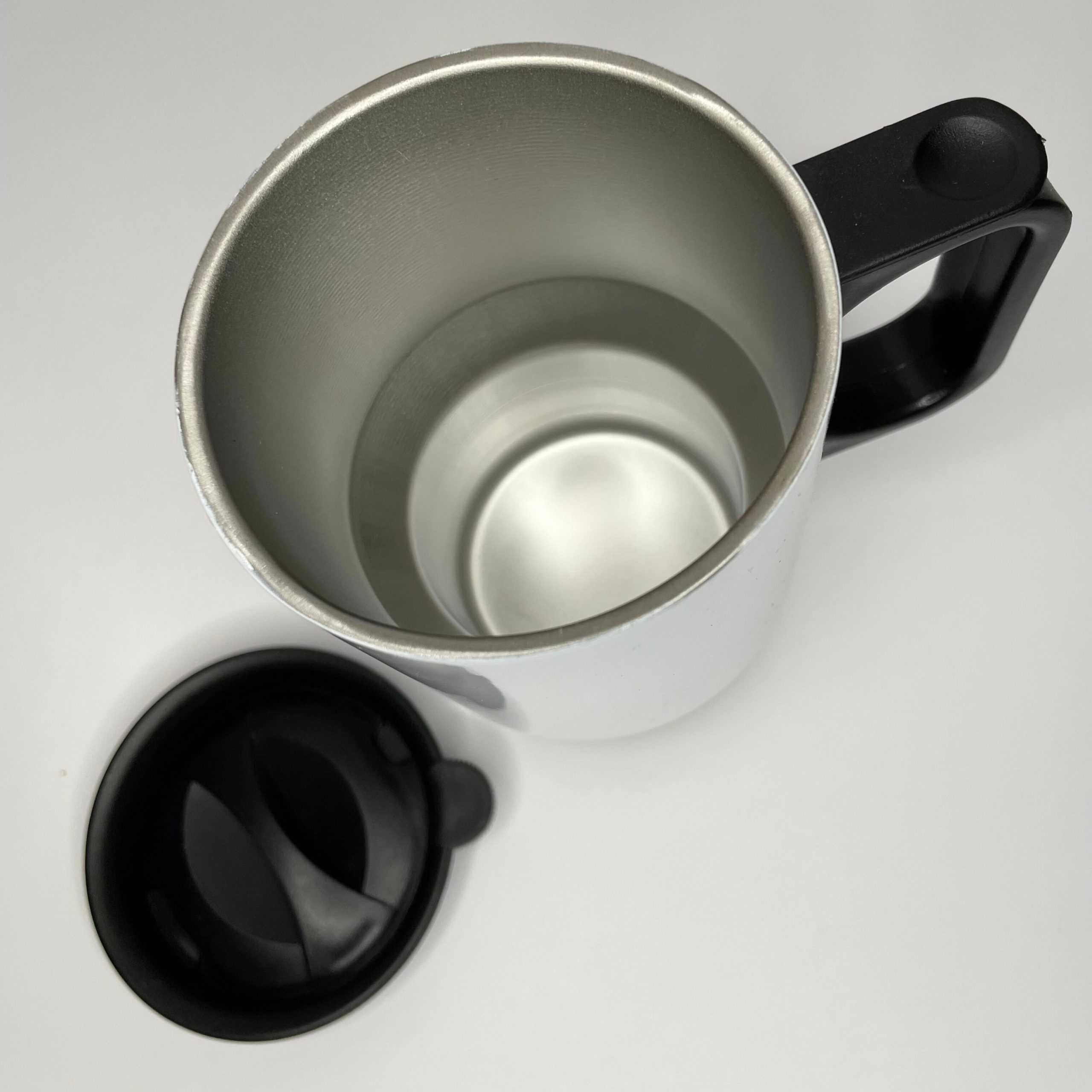 Edelstahl-Thermotasse mit Deckel und Henkel. Die Thermotasse besteht aus doppelwandigem Edelstahl und ist robust, stoßfest und dennoch leicht. Die Trink- und Luftöffnung kann man Dank des Drehgriffes im Deckel öffnen und schließen. Hervorragend geeignet für den Sublimationsdruck von Fotos und personalisierten Botschaften.