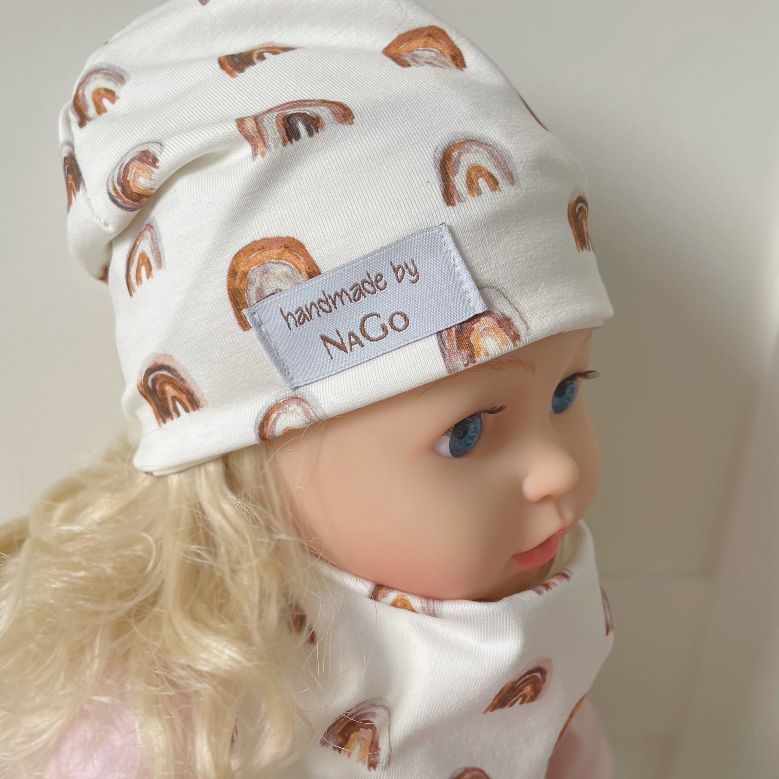 Das süße Set besteht aus Mütze und Halstuch mit Druckknöpfen