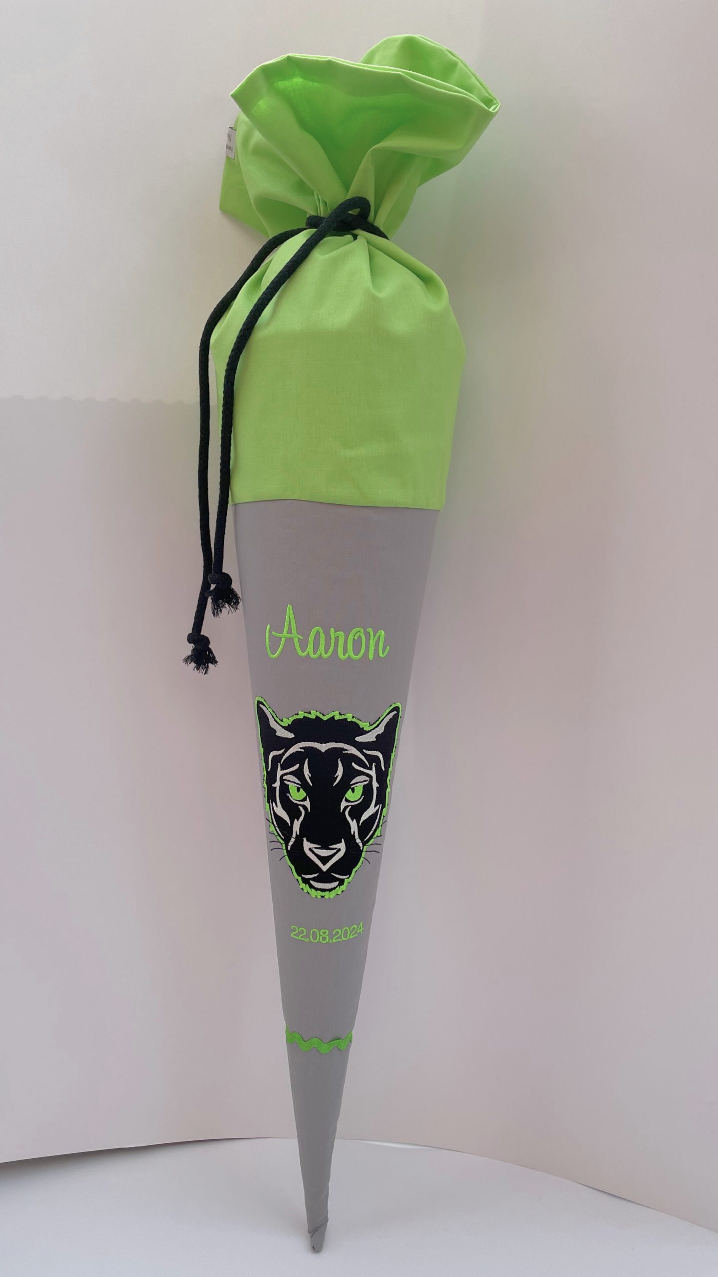 Wunderschöne Schultüte wurde aus Baumwollstoff genäht und mit Panther-Design bestickt.