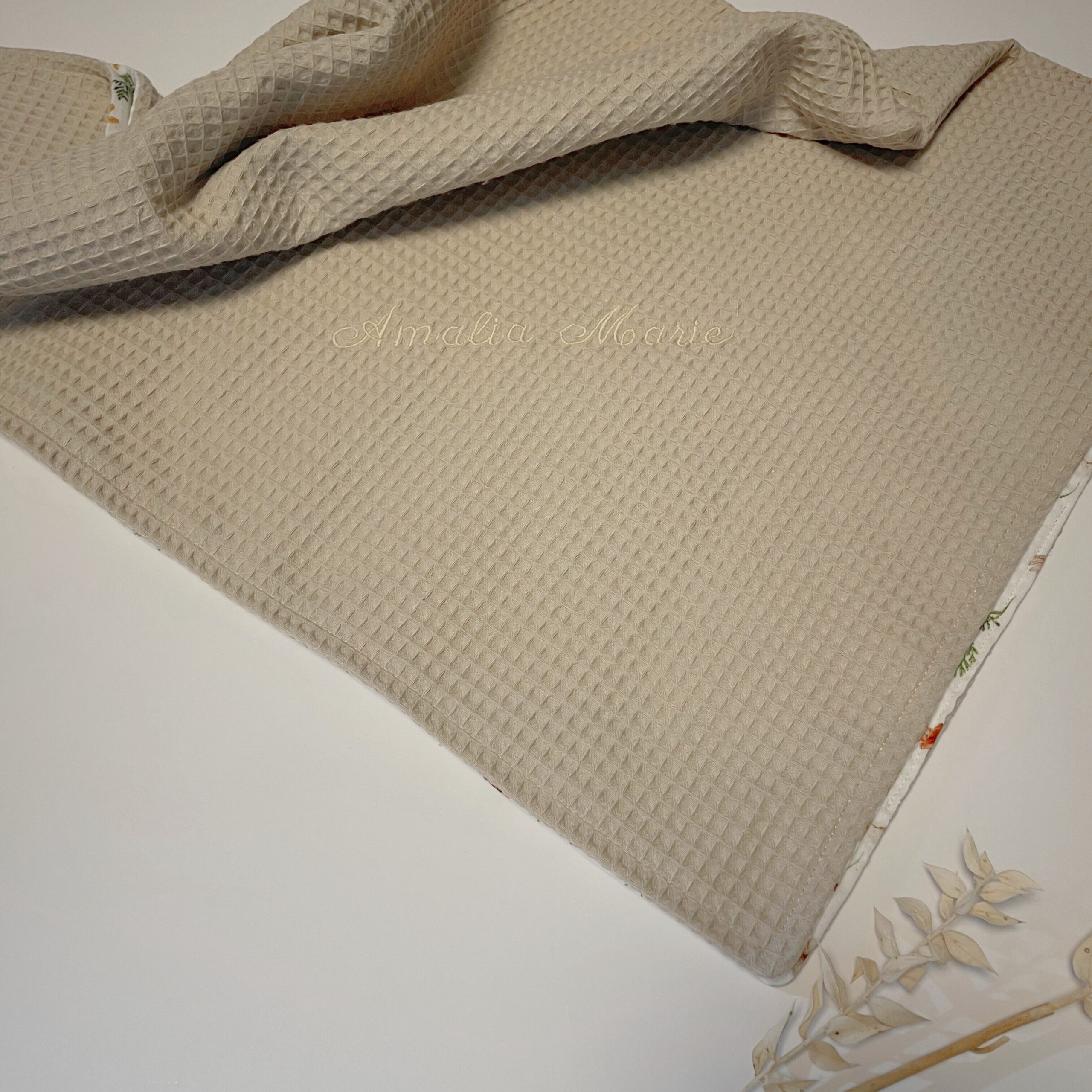 Die leichte Babydecke ist zweilagig und einmal rundherum abgesteppt. Rückseite ist aus wunderschönem Musselin Stoff. Der Name wird aus hochwertigem glänzendem Stickgarn gestickt,