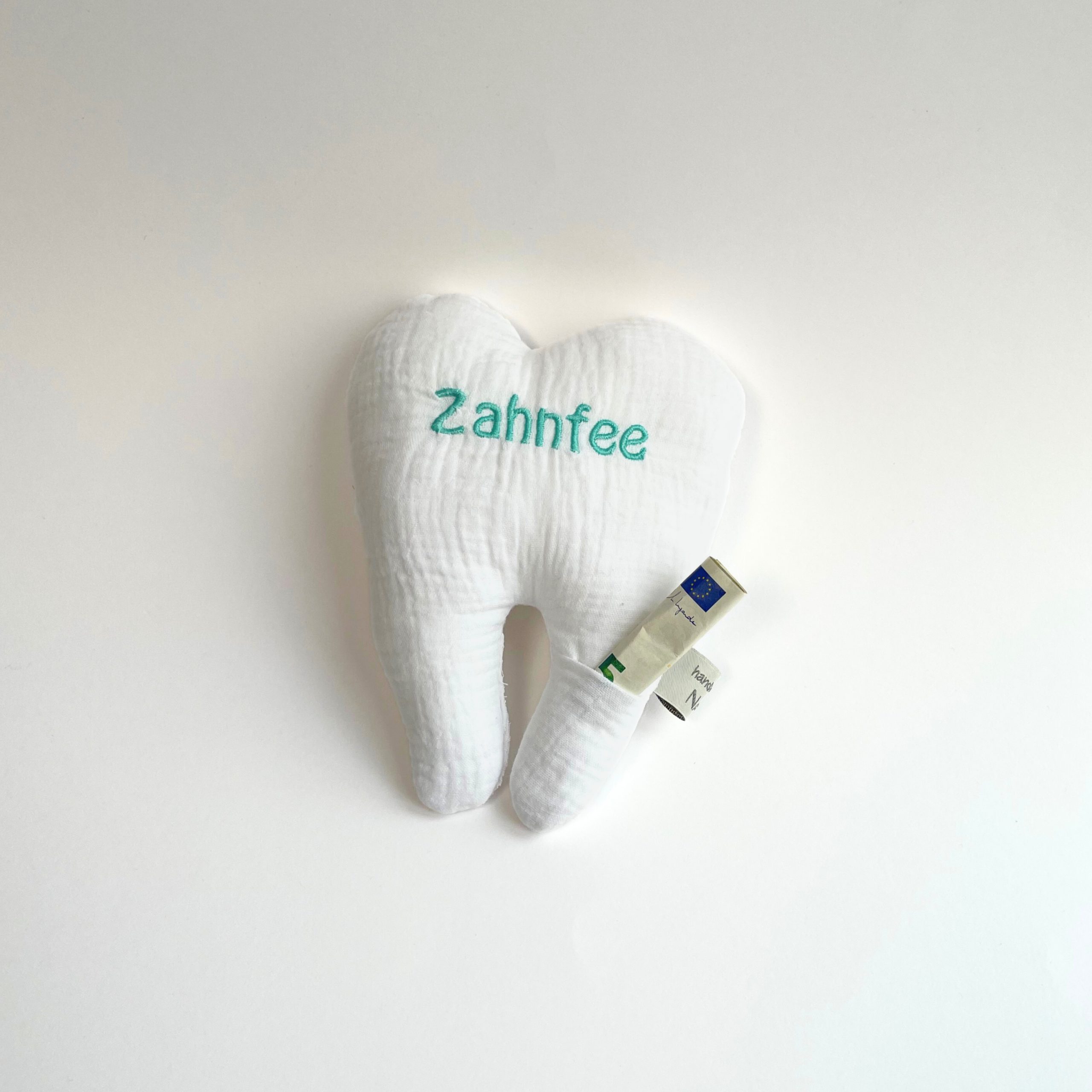 Das niedliche Zahnfee-Kissen ist aus Musselin mit einer Tasche versehen.
