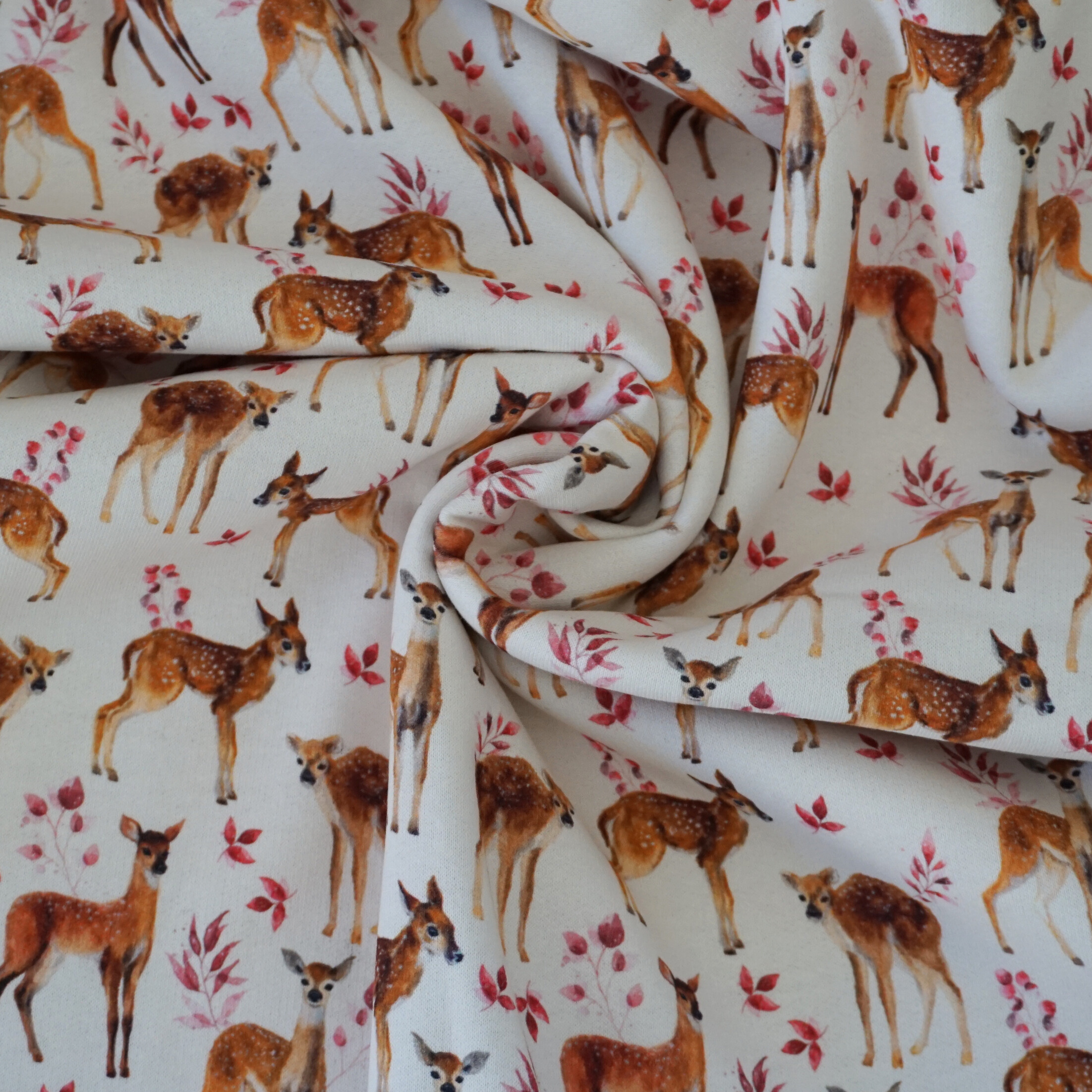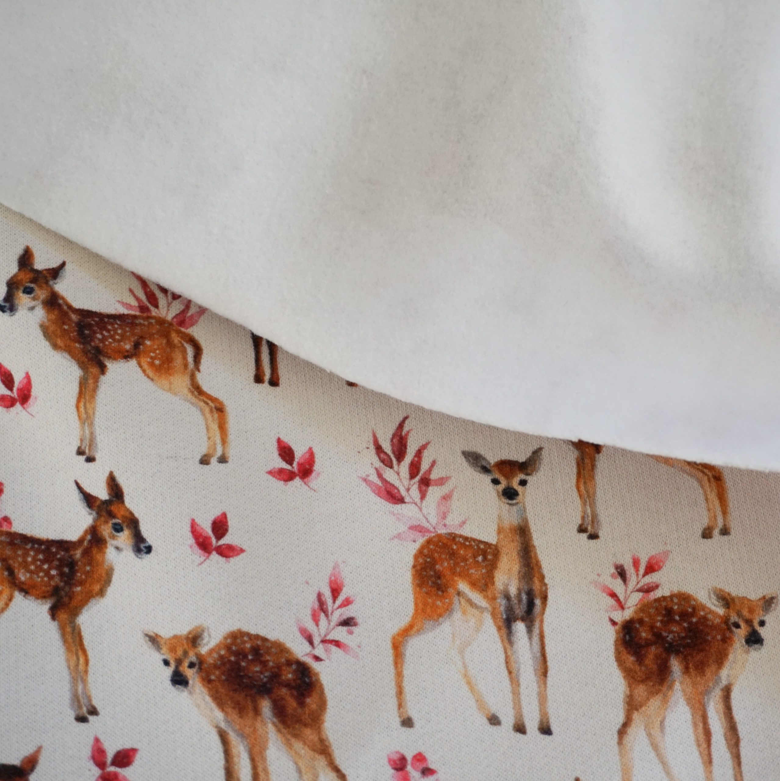 Flauschiger Sweat in wollweiß mit wunderschön natürlich gezeichneten Rehkitzen und rot-violetten Zweigen.